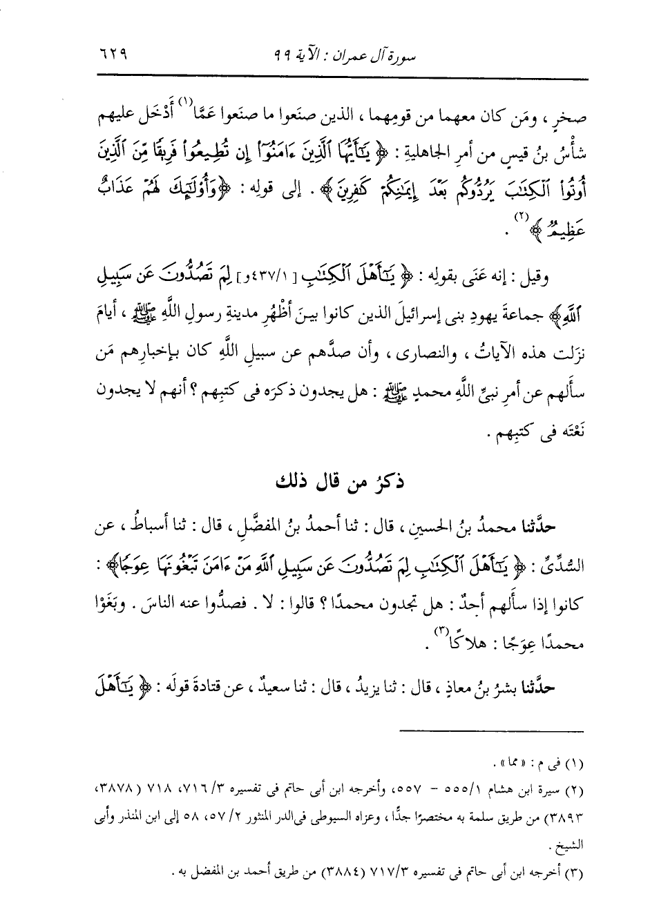 ذِكْرُ مَنْ قَالَ ذَلِكَ: حَدَّثَنَا مُحَمَّدُ بْنُ الْحُسَيْنِ، قَالَ: ثنا أَحْمَدُ بْنُ الْمُفَضَّلِ، قَالَ: ثنا أَسْبَاطٌ، عَنِ السُّدِّيِّ: {يَا أَهْلَ الْكِتَابِ §لِمَ تَصُدُّونَ عَنْ سَبِيلِ اللَّهِ مَنْ آمَنَ تَبْغُونَهَا عِوَجًا} [آل عمران: 99] " كَانُوا إِذَا سَأَلَهُمْ أَحَدٌ: هَلْ تَجِدُونَ مُحَمَّدًا؟ قَالُوا: لَا، فَصَدُّوا عَنْهُ النَّاسَ، وَبَغَوْا مُحَمَّدًا عِوَجًا: هَلَاكًا "
