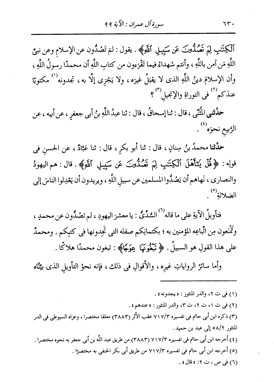 حَدَّثَنَا مُحَمَّدُ بْنُ سِنَانٍ، قَالَ: ثنا أَبُو بَكْرٍ، قَالَ: ثنا عَبَّادٌ، عَنِ الْحَسَنِ، فِي قَوْلِهِ: {§قُلْ يَا أَهْلَ الْكِتَابِ لِمَ تَصُدُّونَ عَنْ سَبِيلِ اللَّهِ} [آل عمران: 99] قَالَ: «هُمُ الْيَهُودُ وَالنَّصَارَى، نَهَاهُمْ أَنْ يَصُدُّوا الْمُسْلِمِينَ عَنْ سَبِيلِ اللَّهِ، وَيُرِيدُونَ أَنْ يَعْدِلُوا النَّاسَ إِلَى الضَّلَالَةِ» فَتَأْوِيلُ الْآيَةِ مَا قَالَهُ السُّدِّيُّ: يَا مَعْشَرَ الْيَهُودِ لِمَ تَصُدُّونَ عَنْ مُحَمَّدٍ، وَتَمْنَعُونَ مِنَ اتِّبَاعِهِ الْمُؤْمِنِينَ بِكِتْمَانِكُمْ صِفَتَهُ الَّتِي تَجِدُونَهَا فِي كُتُبِكُمْ، وَمُحَمَّدٌ عَلَى هَذَا الْقَوْلِ: هُوَ السَّبِيلُ {تَبْغُونَهَا عِوَجًا} [آل عمران: 99] تَبْغُونَ مُحَمَّدًا هَلَاكًا، وَأَمَّا سَائِرُ الرِّوَايَاتِ غَيْرُهُ وَالْأَقْوَالِ فِي ذَلِكَ فَإِنَّهُ نَحْوُ التَّأْوِيلِ الَّذِي بَيَّنَّاهُ -[631]- قَبْلُ، مِنْ أَنَّ مَعْنَى السَّبِيلِ الَّتِي ذَكَرَهَا فِي هَذَا الْمَوْضِعِ الْإِسْلَامُ وَمَا جَاءَ بِهِ مُحَمَّدٌ مِنَ الْحَقِّ مِنْ عِنْدِ اللَّهِ