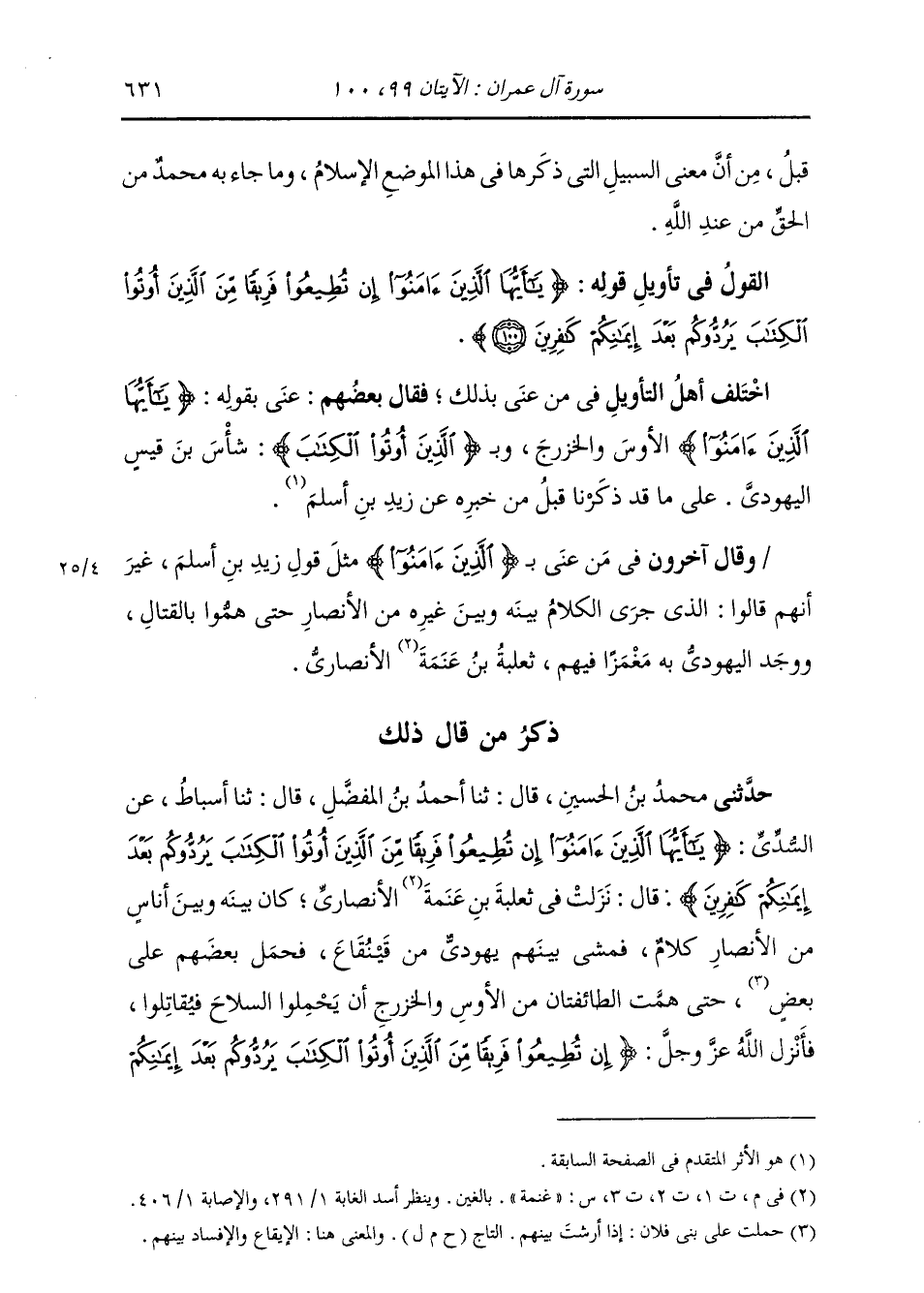 §الْقَوْلُ فِي تَأْوِيلِ قَوْلِهِ تَعَالَى: {يَا أَيُّهَا الَّذِينَ آمَنُوا إِنْ تُطِيعُوا فَرِيقًا مِنَ الَّذِينَ أُوتُوا الْكِتَابَ يَرُدُّوكُمْ بَعْدَ إِيمَانِكُمْ كَافِرِينَ} [آل عمران: 100] اخْتَلَفَ أَهْلُ التَّأْوِيلِ فِيمَنْ عَنَى بذَلِكَ، فَقَالَ بَعْضُهُمْ: عَنَى بِقَوْلِهِ: {يَا أَيُّهَا الَّذِينَ آمَنُوا} [البقرة: 104] الْأَوْسُ وَالْخَزْرَجُ، وَبِالَّذِينَ أُوتُوا الْكِتَابَ: شَاسُ بْنُ قَيْسٍ الْيَهُودِيُّ، عَلَى مَا قَدْ ذَكَرْنَا قَبْلُ مِنْ خَبَرِهِ عَنْ زَيْدِ بْنِ أَسْلَمَ. وَقَالَ آخَرُونَ: فِيمَنْ عَنَى بِالَّذِينَ آمَنُوا، مِثْلَ قَوْلِ زَيْدِ بْنِ أَسْلَمَ، غَيْرَ أَنَّهُمْ قَالُوا: الَّذِي جَرَى الْكَلَامُ بَيْنَهُ وَبَيْنَ غَيْرِهِ مِنَ الْأَنْصَارِ حَتَّى هَمُّوا بِالْقِتَالِ وَوَجَدَ الْيَهُودِيُّ بِهِ مَغْمَزًا فِيهِمْ ثَعْلَبَةُ بْنُ عَنَمَةَ الْأَنْصَارِيُّ