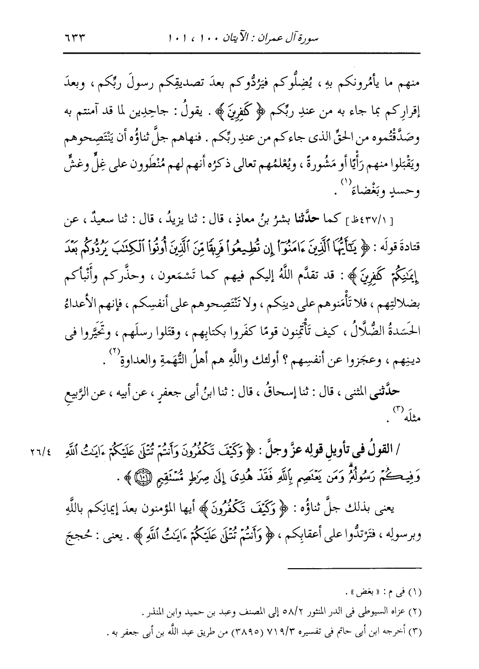 كَمَا: حَدَّثَنَا بِشْرُ بْنُ مُعَاذٍ، قَالَ: ثنا يَزِيدُ، قَالَ: ثنا سَعِيدٌ، عَنْ قَتَادَةَ، قَوْلُهُ: {§يَا أَيُّهَا الَّذِينَ آمَنُوا إِنْ تُطِيعُوا فَرِيقًا مِنَ الَّذِينَ أُوتُوا الْكِتَابَ يَرُدُّوكُمْ بَعْدَ إِيمَانِكُمْ كَافِرِينَ} [آل عمران: 100] : «قَدْ تَقَدَّمَ اللَّهُ إِلَيْكُمْ فِيهِمْ كَمَا تَسْمَعُونَ، وَحَذَّرَكُمْ وَأَنْبَأَكُمْ بِضَلَالَتِهِمْ، فَلَا تَأْمَنُوهُمْ عَلَى دِينِكُمْ وَلَا تَنْتَصِحُوهُمْ عَلَى أَنْفُسِكُمْ، فَإِنَّهُمُ الْأَعْدَاءُ الْحَسَدَةُ الضُّلَّالُ، كَيْفَ تَأَتَمِنُونَ قَوْمًا كَفَرُوا بِكِتَابِهِمْ، وَقَتَلُوا رُسُلَهُمْ، وَتَحَيَّرُوا فِي دِينِهِمْ، وَعَجَزُوا عَنْ أَنْفُسِهِمْ؟ أُولَئِكَ وَاللَّهِ هُمْ أَهْلُ التُّهْمَةِ وَالْعَدَاوَةِ» حَدَّثَنَا الْمُثَنَّى، قَالَ: ثنا إِسْحَاقُ، قَالَ: ثنا ابْنُ أَبِي جَعْفَرٍ، عَنْ أَبِيهِ، عَنِ الرَّبِيعِ، مِثْلَهُ