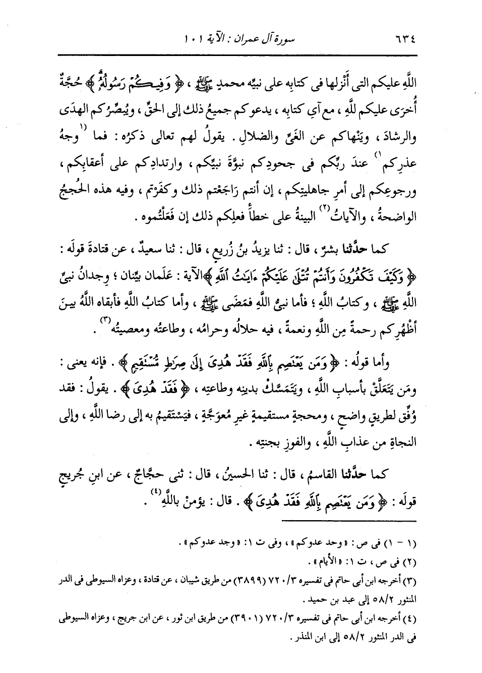 كَمَا: حَدَّثَنَا بِشْرٌ، قَالَ: ثنا يَزِيدُ بْنُ زُرَيْعٍ، قَالَ: ثنا سَعِيدٌ، عَنْ قَتَادَةَ، قَوْلُهُ: {§وَكَيْفَ تَكْفُرُونَ وَأَنْتُمْ تُتْلَى عَلَيْكُمْ آيَاتُ اللَّهِ} [آل عمران: 101] الْآيَةَ، " عِلْمَانِ بِيِّنَانِ: وُجْدَانُ نَبِيِّ اللَّهِ صَلَّى اللهُ عَلَيْهِ وَسَلَّمَ، وَكِتَابُ اللَّهِ؛ فَأَمَّا نَبِيُّ اللَّهِ فَمَضَى صَلَّى اللهُ عَلَيْهِ وَسَلَّمَ؛ وَأَمَّا كِتَابُ اللَّهِ، فَأَبْقَاهُ اللَّهُ بَيْنَ أَظْهُرِكُمْ رَحْمَةً مِنَ اللَّهِ وَنِعْمَةً فِيهِ حَلَالُهُ وَحَرَامُهُ، وَطَاعَتُهُ وَمَعْصِيَتُهُ " وَأَمَّا قَوْلُهُ: {مَنْ يَعْتَصِمْ بِاللَّهِ فَقَدْ هُدِيَ إِلَى صِرَاطٍ مُسْتَقِيمٍ} [آل عمران: 101] فَإِنَّهُ يَعْنِي: وَمَنْ يَتَعَلَّقْ بِأَسْبَابِ اللَّهِ، وَيَتَمَسَّكْ بِدِينِهِ وَطَاعَتِهِ، {فَقَدْ هُدِيَ} [آل عمران: 101] يَقُولُ: فَقَدْ وُفِّقَ لِطَرِيقٍ وَاضِحٍ وَمَحَجَّةٍ مُسْتَقِيمَةٍ غَيْرِ مُعْوَجَّةٍ، فَيَسْتَقِيمُ بِهِ إِلَى رِضَا اللَّهِ وَإِلَى النَّجَاةِ مِنْ عَذَابِ اللَّهِ وَالْفَوْزِ بِجَنَّتِهِ