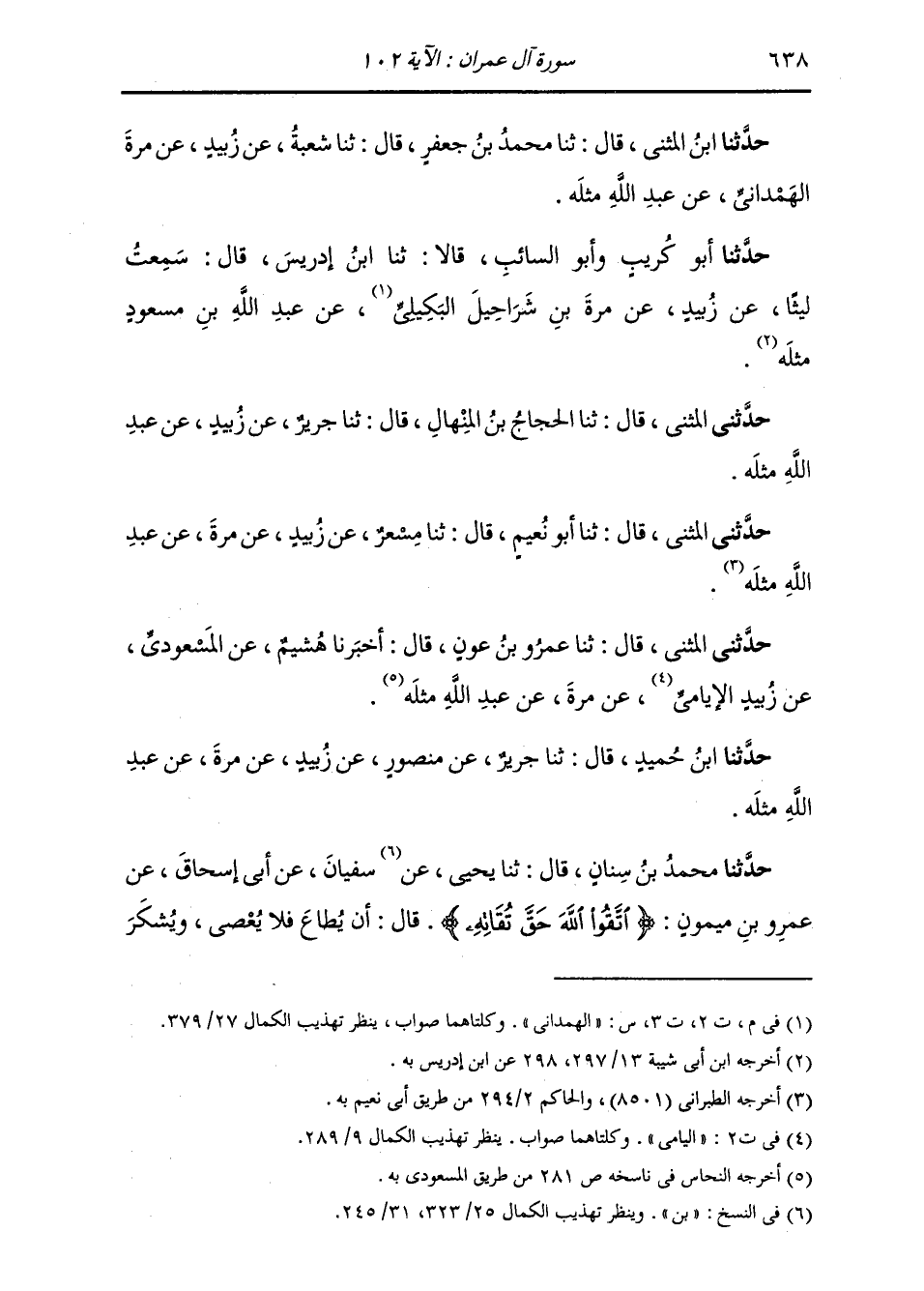 حَدَّثَنَا مُحَمَّدُ بْنُ سِنَانٍ، قَالَ: ثنا يَحْيَى بْنُ سُفْيَانَ، عَنْ أَبِي إِسْحَاقَ، عَنْ عَمْرِو بْنِ مَيْمُونٍ: {§اتَّقُوا اللَّهَ حَقَّ تُقَاتِهِ} [آل عمران: 102] قَالَ: «أَنْ يُطَاعَ فَلَا يُعْصَى، وَيُشْكَرَ -[639]- فَلَا يُكْفَرَ، وَيُذْكَرَ فَلَا يُنْسَى» حَدَّثَنَا ابْنُ وَكِيعٍ، قَالَ: ثنا أَبِي، عَنْ إِسْرَائِيلَ، عَنْ أَبِي إِسْحَاقَ، عَنْ عَمْرِو بْنِ مَيْمُونٍ، نَحْوَهُ