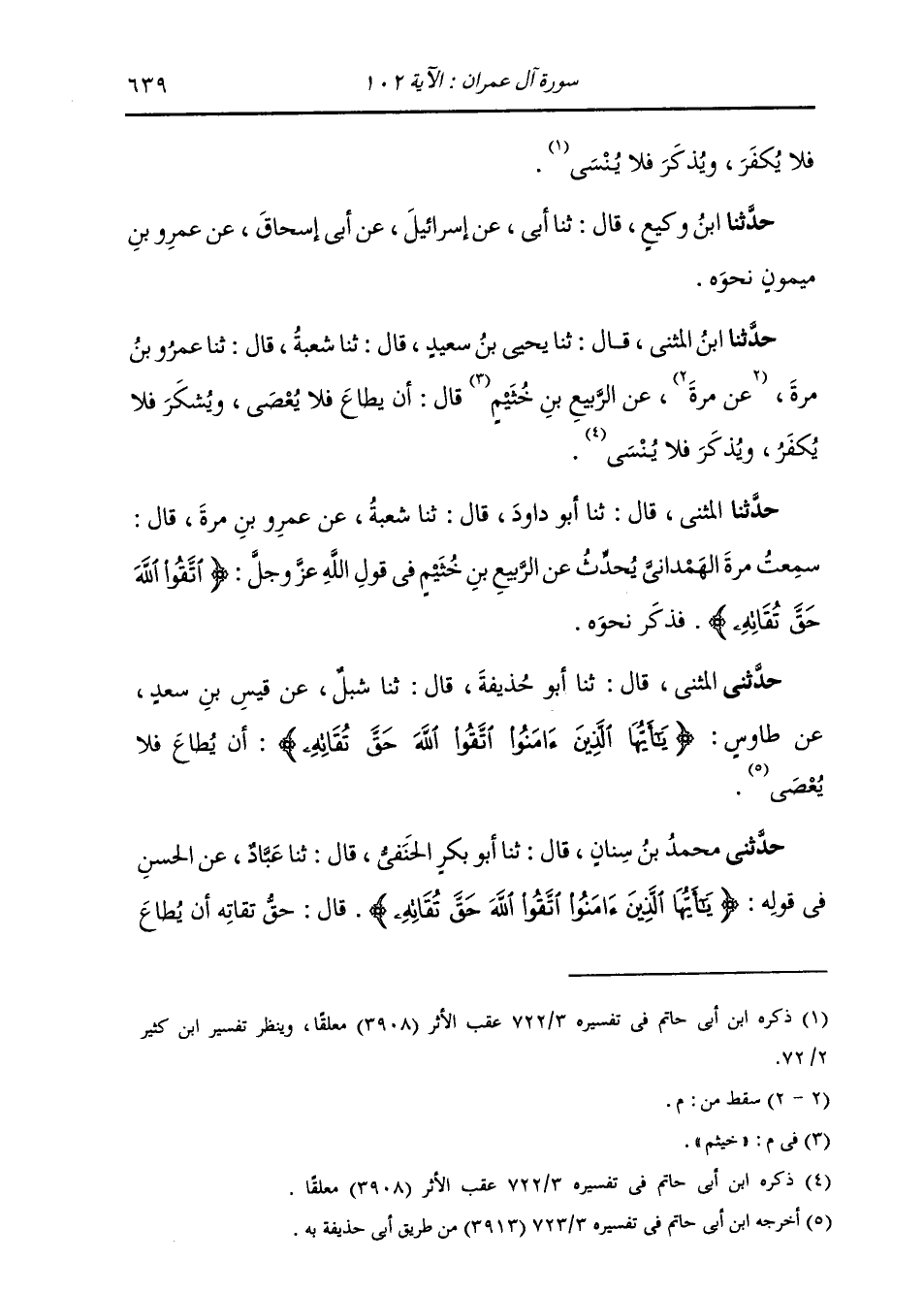 حَدَّثَنَا ابْنُ الْمُثَنَّى، قَالَ: ثنا يَحْيَى بْنُ سَعِيدٍ، قَالَ: ثنا شُعْبَةُ، قَالَ: ثنا عَمْرُو بْنُ مُرَّةَ، عَنِ الرَّبِيعِ بْنِ خُثَيْمٍ، قَالَ: «§أَنْ يُطَاعَ فَلَا يُعْصَى، وَيُشْكَرَ فَلَا يُكْفَرَ، وَيُذْكَرَ فَلَا يُنْسَى» حَدَّثَنَا الْمُثَنَّى، قَالَ: ثنا أَبُو دَاوُدَ، قَالَ: ثنا شُعْبَةُ، عَنْ عَمْرِو بْنِ مُرَّةَ، قَالَ: سَمِعْتُ مُرَّةَ الْهَمْدَانِيَّ يُحَدِّثُ عَنِ الرَّبِيعِ بْنِ خُثَيْمٍ فِي قَوْلِ اللَّهِ عَزَّ وَجَلَّ: {اتَّقُوا اللَّهَ حَقَّ تُقَاتِهِ} [آل عمران: 102] فَذَكَرَ نَحْوَهُ
