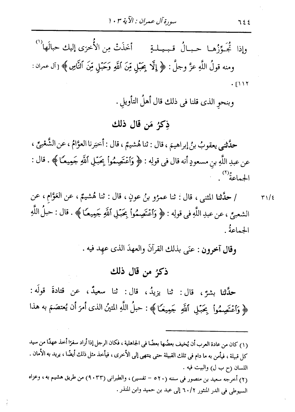 حَدَّثَنَا الْمُثَنَّى، قَالَ: ثنا عَمْرُو بْنُ عَوْنٍ، قَالَ: ثنا هُشَيْمٌ، عَنِ الْعَوَّامِ، عَنِ الشَّعْبِيِّ، عَنْ عَبْدِ اللَّهِ فِي قَوْلِهِ: {§وَاعْتَصِمُوا بِحَبْلِ اللَّهِ جَمِيعًا} [آل عمران: 103] قَالَ: " حَبَلُ اللَّهِ: الْجَمَاعَةُ " وَقَالَ آخَرُونَ: عَنَى بِذَلِكَ الْقُرْآنَ، وَالْعَهْدَ الَّذِي عَهِدَ فِيهِ