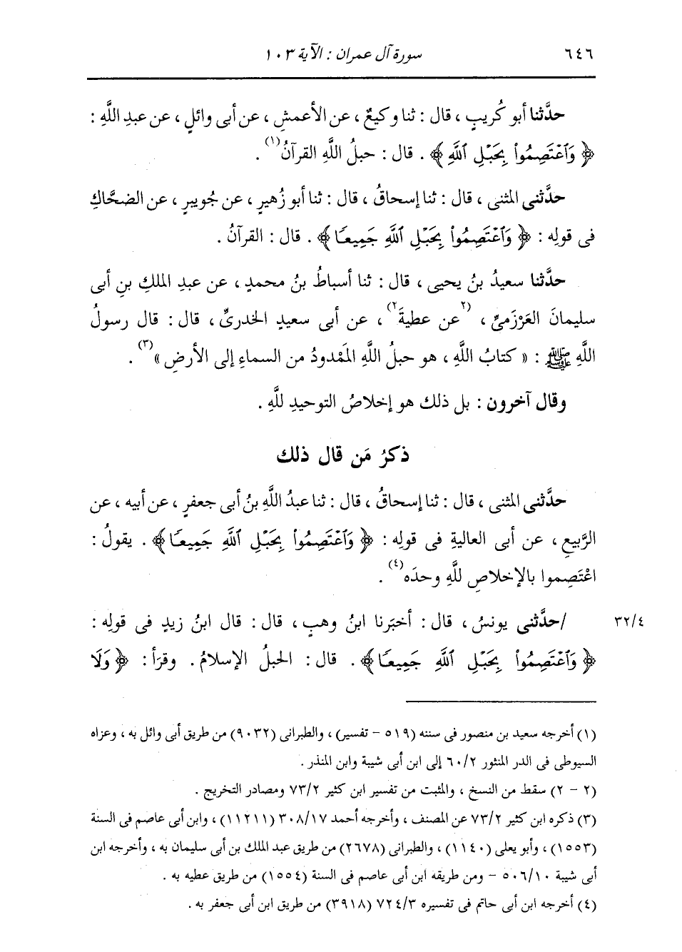 حَدَّثَنِي الْمُثَنَّى، قَالَ: ثنا إِسْحَاقُ، قَالَ: ثنا أَبُو زُهَيْرٍ، عَنْ جُوَيْبِرٍ، عَنِ الضَّحَّاكِ، فِي قَوْلِهِ: {§وَاعْتَصِمُوا بِحَبْلِ اللَّهِ جَمِيعًا} [آل عمران: 103] قَالَ: «الْقُرْآنُ»