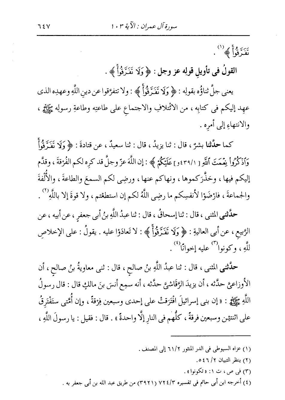 §الْقَوْلُ فِي تَأْوِيلِ قَوْلِهِ تَعَالَى: {وَلَا تَفَرَّقُوا} [آل عمران: 103] يَعْنِي جَلَّ ثناؤُهُ بِقَوْلِهِ: {وَلَا تَفَرَّقُوا} [آل عمران: 103] وَلَا تَتَفَرَّقُوا عَنْ دِينِ اللَّهِ وَعَهْدِهِ الَّذِي عَهِدَ إِلَيْكُمْ فِي كِتَابِهِ مِنَ الِائْتِلَافِ وَالِاجْتِمَاعِ عَلَى طَاعَتِهِ وَطَاعَةِ رَسُولِهِ صَلَّى اللهُ عَلَيْهِ وَسَلَّمَ وَالِانْتِهَاءِ إِلَى أَمْرِهِ