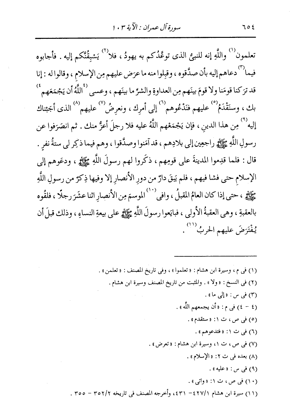 تَعْلَمُونَ وَاللَّهِ إِنَّهُ لَلنَّبِيُّ الَّذِي تُوعِدُكُمْ بِهِ يَهُودُ، وَلَا يَسْبِقَنَّكُمْ إِلَيْهِ، فَأَجَابُوهُ فِيمَا دَعَاهُمْ إِلَيْهِ بِأَنْ صَدَّقُوهُ، وَقَبِلُوا مِنْهُ مَا عَرَضَ عَلَيْهِمْ مِنَ الْإِسْلَامِ، وَقَالُوا لَهُ: إِنَّا قَدْ تَرَكْنَا قَوْمَنَا، وَلَا قَوْمَ بَيْنَهُمْ مِنَ الْعَدَاوَةَ وَالشَّرِّ مَا بَيْنَهُمْ، وَعَسَى أَنْ يَجْمَعَهُمُ اللَّهُ بِكَ، وَسَنَقْدُمُ عَلَيْهِمْ، فَنَدْعُوَهُمْ إِلَى أَمْرِكَ، وَنَعْرِضَ عَلَيْهِمُ الَّذِي أَجَبْنَاكَ إِلَيْهِ مِنْ هَذَا الدِّينِ، فَإِنْ يَجْمَعَهُمُ اللَّهُ عَلَيْهِ، فَلَا رَجُلَ أَعَزُّ مِنْكَ ثُمَّ انْصَرَفُوا عَنْ رَسُولِ اللَّهِ صَلَّى اللهُ عَلَيْهِ وَسَلَّمَ، رَاجِعِينَ إِلَى بِلَادِهِمْ، قَدْ آمَنُوا وَصَدَّقُوا، وَهُمْ فِيمَا ذُكِرَ لِي سِتَّةُ نَفَرٍ، قَالَ: فَلَمَّا قَدِمُوا الْمَدِينَةَ عَلَى قَوْمِهِمْ، ذَكَرُوا لَهُمْ رَسُولَ اللَّهِ صَلَّى اللهُ عَلَيْهِ وَسَلَّمَ، وَدَعَوْهُمْ إِلَى الْإِسْلَامِ، حَتَّى فَشَا فِيهِمْ، فَلَمْ يَبْقَ دَارٌ مِنْ دُورِ الْأَنْصَارِ إِلَّا وَفِيهَا ذِكْرٌ مِنْ رَسُولِ اللَّهِ صَلَّى اللهُ عَلَيْهِ وَسَلَّمَ حَتَّى إِذَا كَانَ الْعَامُ الْمُقْبِلُ، وَافَى الْمَوْسِمَ مِنَ الْأَنْصَارِ اثْنَا عَشَرَ رَجُلًا، فَلَقَوْهُ بِالْعَقَبَةِ، وَهِيَ الْعَقَبَةُ الْأُولَى، فَبَايَعُوا رَسُولَ اللَّهِ صَلَّى اللهُ عَلَيْهِ وَسَلَّمَ عَلَى بَيْعَةِ النِّسَاءِ، وَذَلِكَ قَبْلَ أَنْ تُفْتَرَضَ عَلَيْهِمُ الْحَرْبُ