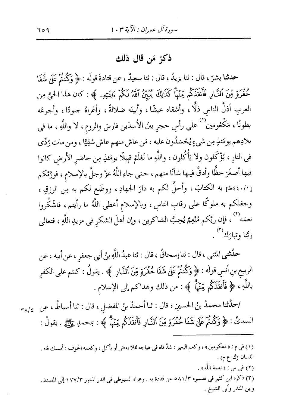 ذِكْرُ مَنْ قَالَ ذَلِكَ: حَدَّثَنَا بِشْرٌ، قَالَ: ثنا يَزِيدُ، قَالَ: ثنا سَعِيدٌ، عَنْ قَتَادَةَ، قَوْلُهُ: {§وَكُنْتُمْ عَلَى شَفَا حُفْرَةٍ مِنَ النَّارِ فَأَنْقَذَكُمْ مِنْهَا كَذَلِكَ يُبَيِّنُ اللَّهُ لَكُمْ آيَاتِهِ} [آل عمران: 103] " كَانَ هَذَا الْحَيُّ مِنَ الْعَرَبِ أَذَلَّ النَّاسِ ذُلًّا، وَأَشْقَاهُ عَيْشًا، وَأَبْيَنَهُ ضَلَالَةً، وَأَعْرَاهُ جُلُودًا، وَأَجْوَعَهُ بُطُونًا، مَكْعُومِينَ عَلَى رَأْسِ حَجَرٍ بَيْنَ الْأَسَدَيْنِ: فَارِسَ، وَالرُّومِ، لَا وَاللَّهِ مَا فِي بِلَادِهِمْ يَوْمَئِذٍ مِنْ شَيْءٍ يُحْسَدُونَ عَلَيْهِ، مَنْ عَاشَ مِنْهُمْ عَاشَ شَقِيًّا وَمَنْ مَاتَ رُدِّيَ فِي النَّارِ، يُؤْكَلُونَ وَلَا يَأْكُلُونَ، وَاللَّهِ مَا نَعْلَمُ قَبِيلًا يَوْمَئِذٍ مِنْ حَاضِرِ الْأَرْضِ، كَانُوا فِيهَا أَصْغَرَ حَظًّا وَأَدَقَّ فِيهَا شَأْنًا مِنْهُمْ، حَتَّى جَاءَ اللَّهُ عَزَّ وَجَلَّ بِالْإِسْلَامِ، فَوَرَّثَكُمْ بِهِ الْكِتَابَ، وَأَحَلَّ لَكُمْ بِهِ دَارَ الْجِهَادِ، وَوَضَعَ لَكُمْ بِهِ مِنَ الرِّزْقِ، وَجَعَلَكُمْ بِهِ مُلُوكًا عَلَى رِقَابِ النَّاسِ، وَبِالْإِسْلَامِ أَعْطَى اللَّهُ مَا رَأَيْتُمْ، فَاشْكُرُوا نِعَمَهُ، فَإِنَّ رَبَّكُمْ مُنْعِمٌ يُحِبُّ الشَّاكِرِينَ، وَإِنَّ أَهْلَ الشُّكْرِ فِي مَزِيدِ اللَّهِ، فَتَعَالَى رَبُّنَا وَتَبَارَكَ "