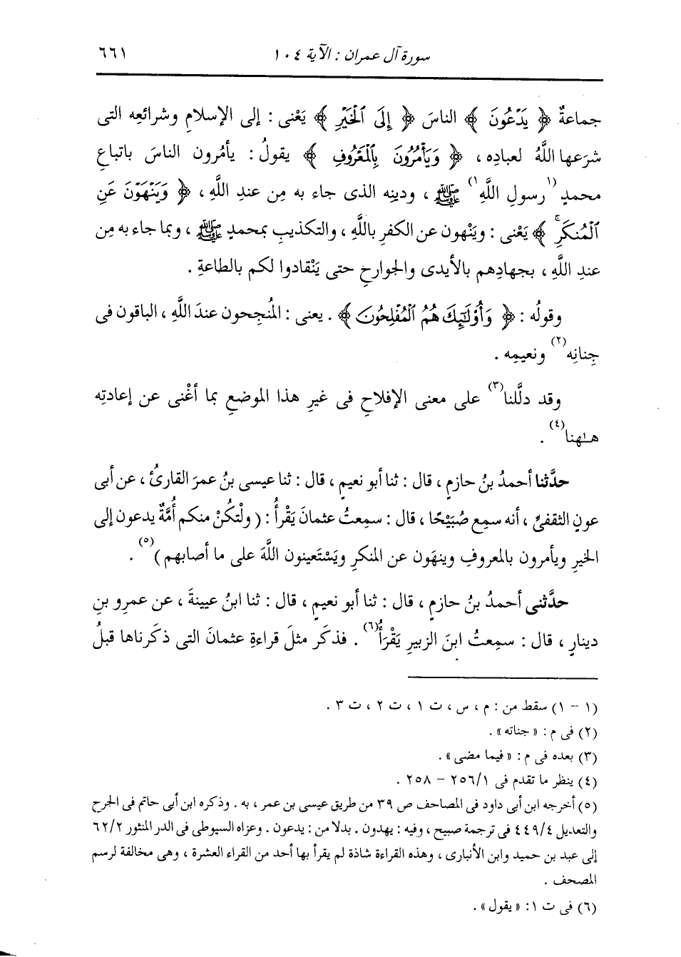حَدَّثَنَا أَحْمَدُ بْنُ حَازِمٍ، قَالَ: ثنا أَبُو نُعَيْمٍ، قَالَ: ثنا عِيسَى بْنُ عُمَرَ الْقَارِئُ، عَنْ أَبِي عَوْنٍ الثَّقَفِيِّ، أَنَّهُ سَمِعَ صُبَيْحًا، قَالَ: سَمِعْتُ عُثْمَانَ، يَقْرَأُ: «§وَلْتَكُنْ مِنْكُمْ أُمَّةٌ يَدْعُونَ إِلَى الْخَيْرِ وَيَأْمُرُونَ بِالْمَعْرُوفِ وَيَنْهَوْنَ عَنِ الْمُنْكَرِ وَيَسْتَعِينُونَ اللَّهَ عَلَى مَا أَصَابَهُمْ» حَدَّثَنِي أَحْمَدُ بْنُ حَازِمٍ، قَالَ: ثنا أَبُو نُعَيْمٍ، قَالَ: ثنا ابْنُ عُيَيْنَةَ، عَنْ عَمْرِو بْنِ دِينَارٍ، قَالَ: سَمِعْتُ ابْنَ الزُّبَيْرِ، يَقْرَأُ، فَذَكَرَ مِثْلَ قِرَاءَةِ عُثْمَانَ الَّتِي ذَكَرْنَاهَا قَبْلُ -[662]- سَوَاءً