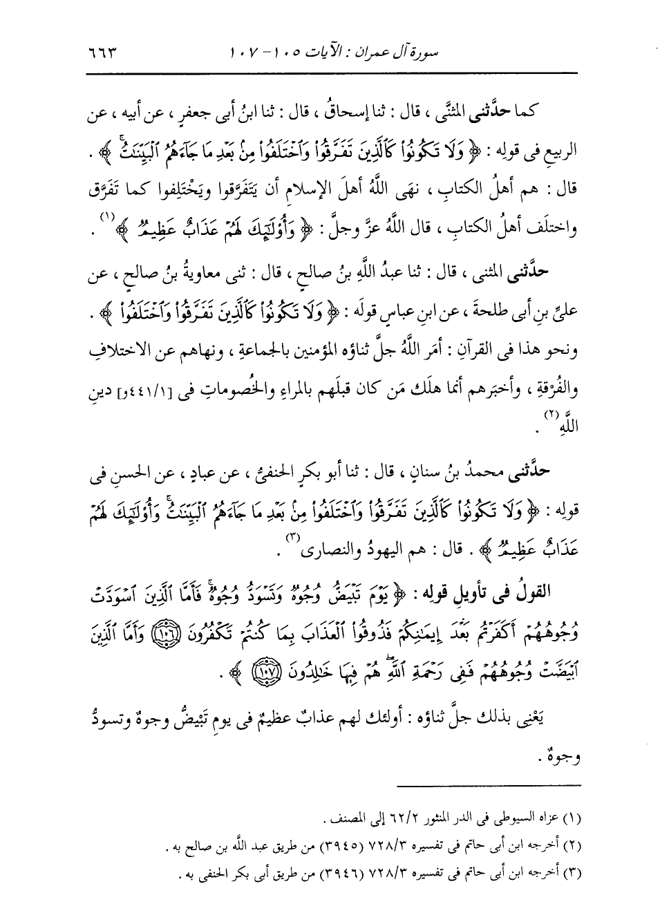 حَدَّثَنِي الْمُثَنَّى، قَالَ: ثنا عَبْدُ اللَّهِ بْنُ صَالِحٍ، قَالَ: ثني مُعَاوِيَةُ بْنُ صَالِحٍ، عَنْ عَلِيِّ بْنِ أَبِي طَلْحَةَ، عَنِ ابْنِ عَبَّاسٍ، قَوْلُهُ: {§وَلَا تَكُونُوا كَالَّذِينَ تَفَرَّقُوا وَاخْتَلَفُوا} [آل عمران: 105] «وَنَحْوُ هَذَا فِي الْقُرْآنِ أَمَرَ اللَّهُ جَلَّ ثناؤُهُ الْمُؤْمِنِينَ بِالْجَمَاعَةِ، فَنَهَاهُمْ عَنِ الِاخْتِلَافِ وَالْفُرْقَةِ، وَأَخْبَرَهُمْ إِنَّمَا هَلَكَ مَنْ كَانَ قَبْلَهُمْ بِالْمِرَاءِ وَالْخُصُومَاتِ فِي دِينِ اللَّهِ»