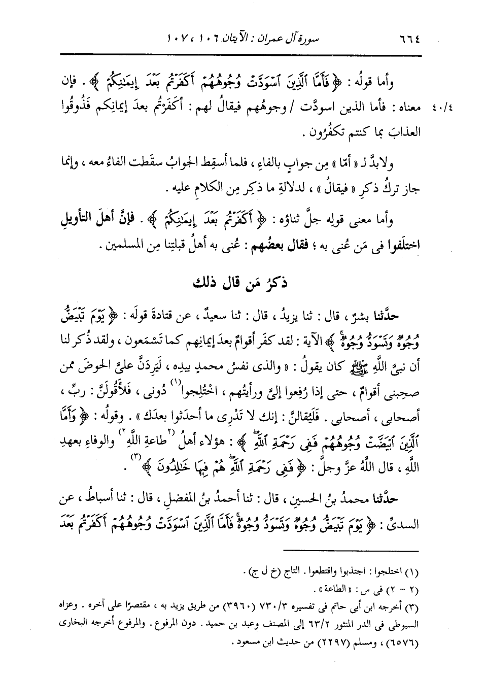 وَأَمَّا قَوْلُهُ: {فَأَمَّا الَّذِينَ اسْوَدَّتْ وُجُوهُهُمْ أَكَفَرْتُمْ بَعْدَ إِيمَانِكُمْ} [آل عمران: 106] فَإِنَّ مَعْنَاهُ: فَأَمَّا الَّذِينَ اسْوَدَّتْ وُجُوهُهُمْ، فَيُقَالُ لَهُمْ: {أَكَفَرْتُمْ بَعْدَ إِيمَانِكُمْ فَذُوقُوا الْعَذَابَ بِمَا كُنْتُمْ تَكْفُرُونَ} [آل عمران: 106] وَلَا بُدَّ لِ «أَمَّا» مِنْ جَوَّابِ بِالْفَاءِ، فَلَمَّا أُسْقِطَ الْجَوَّابُ سَقَطَتِ الْفَاءُ مَعَهُ، وَإِنَّمَا جَازَ تَرْكُ ذِكْرِهِ «فَيُقَالُ» لِدَلَالَةِ مَا ذُكِرَ مِنَ الْكَلَامِ عَلَيْهِ. وَأَمَّا مَعْنَى قَوْلِهِ جَلَّ ثناؤُهُ: {أَكَفَرْتُمْ بَعْدَ إِيمَانِكُمْ} [آل عمران: 106] فَإِنَّ أَهْلَ التَّأْوِيلِ اخْتَلَفُوا فِيمَنْ عُنِيَ بِهِ، فَقَالَ بَعْضُهُمْ: عُنِيَ بِهِ أَهْلُ قِبْلَتِنَا مِنَ الْمُسْلِمِينَ