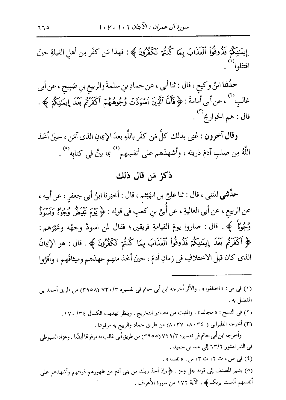 ذِكْرُ مَنْ قَالَ ذَلِكَ: حَدَّثَنِي الْمُثَنَّى، قَالَ: ثنا عَلِيُّ بْنُ الْهَيْثَمِ، قَالَ: أَخْبَرَنَا ابْنُ أَبِي جَعْفَرٍ، عَنْ أَبِيهِ، عَنِ الرَّبِيعِ، عَنْ أَبِي الْعَالِيَةِ، عَنْ أُبَيِّ بْنِ كَعْبٍ، فِي قَوْلِهِ: {§يَوْمَ تَبْيَضُّ وُجُوهٌ وَتَسْوَدُّ وُجُوهٌ} [آل عمران: 106] قَالَ: «صَارُوا يَوْمَ الْقِيَامَةِ فَرِيقَيْنِ، فَقَالَ لِمَنِ اسْوَدَّ وَجْهُهُ وَغَيْرِهِمْ» {أَكَفَرْتُمْ بَعْدَ إِيمَانِكُمْ فَذُوقُوا الْعَذَابَ بِمَا كُنْتُمْ تَكْفُرُونَ} [آل عمران: 106] قَالَ: " هُوَ الْإِيمَانُ الَّذِي كَانَ قَبْلَ الِاخْتِلَافِ فِي زَمَانِ آدَمَ، حِينَ أَخَذَ مِنْهُمْ عَهْدَهُمْ وَمِيثَاقَهُمْ، وَأَقَرُّوا -[666]- كُلُّهُمْ بِالْعُبُودِيَّةِ، وَفَطَرَهُمْ عَلَى الْإِسْلَامِ، فَكَانُوا أُمَّةً وَاحِدَةً مُسْلِمَيْنَ، يَقُولُ: أَكَفَرْتُمْ بَعْدَ إِيمَانِكُمْ، يَقُولُ بَعْدَ ذَلِكَ الَّذِي كَانَ فِي زَمَانِ آدَمَ، وَقَالَ فِي الْآخَرِينَ: الَّذِينَ اسْتَقَامُوا عَلَى إِيمَانِهِمْ ذَلِكَ، فَأَخْلَصُوا لَهُ الدِّينَ وَالْعَمَلَ، فَبَيَّضَ اللَّهُ وُجُوهَهُمْ، وَأَدْخَلَهُمْ فِي رِضْوَانِهِ وَجَنَّتِهِ " وَقَالَ آخَرُونَ: بَلِ الَّذِينَ عُنُوا بِقَوْلِهِ: {أَكَفَرْتُمْ بَعْدَ إِيمَانِكُمْ} [آل عمران: 106] الْمُنَافِقُونَ