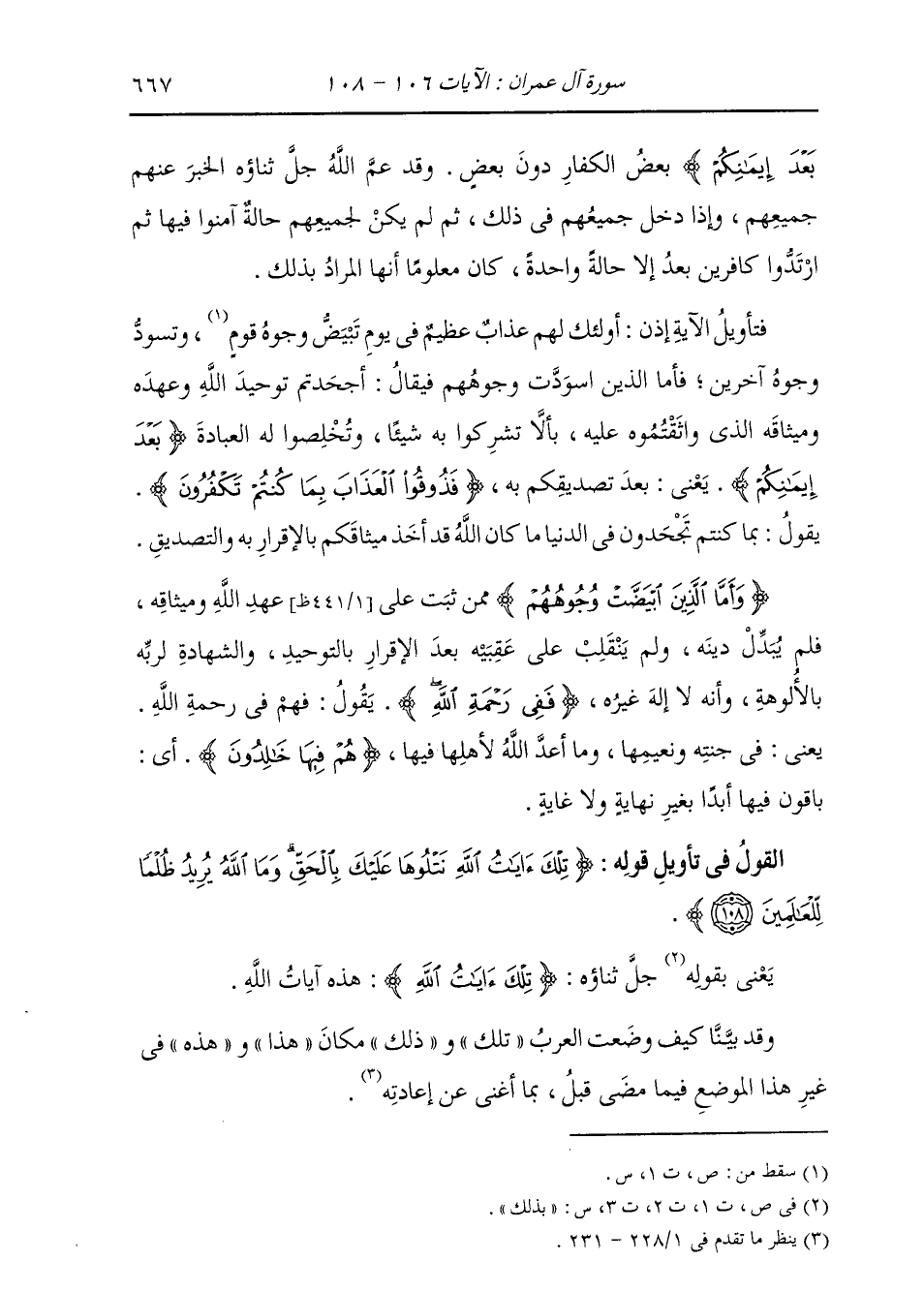§الْقَوْلُ فِي تَأْوِيلِ قَوْلِهِ تَعَالَى: {تِلْكَ آيَاتُ اللَّهِ نَتْلُوهَا عَلَيْكَ بِالْحَقِّ وَمَا اللَّهُ يُرِيدُ ظُلْمًا لِلْعَالَمِينَ} [آل عمران: 108] يَعْنِي بِقَوْلِهِ جَلَّ ثناؤُهُ: {تِلْكَ آيَاتُ اللَّهِ} [البقرة: 252] هَذِهِ آيَاتُ اللَّهِ وَقَدْ بَيَّنَّا كَيْفَ وَضَعَتِ الْعَرَبُ «تِلْكَ» وَ «ذَلِكَ» مَكَانَ «هَذَا» وَ «هَذِهِ» فِي غَيْرِ هَذَا الْمَوْضِعِ فِيمَا مَضَى قَبْلُ بِمَا أَغْنَى عَنْ إِعَادَتِهِ،
