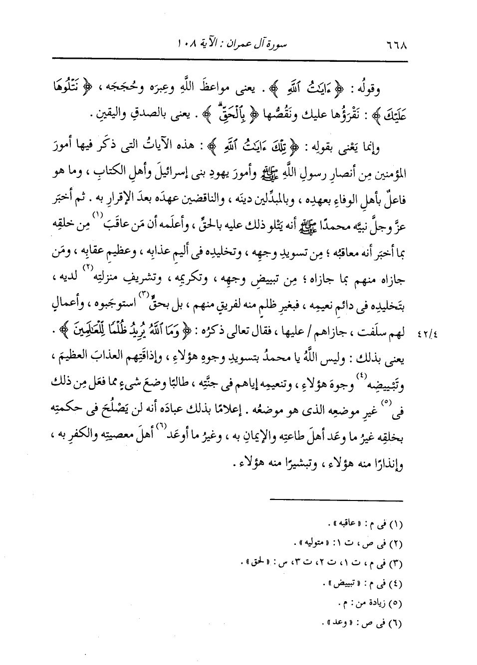 وَقَوْلُهُ: {آيَاتُ اللَّهِ} [البقرة: 231] يَعْنِي مَوَاعِظَ اللَّهِ، وَعِبَرَهُ وَحُجَجَهُ. {نَتْلُوهَا عَلَيْكَ} [البقرة: 252] نَقْرَؤُهَا عَلَيْكَ وَنَقُصُّهَا {بِالْحَقِّ} [البقرة: 71] يَعْنِي: بِالصِّدْقِ وَالْيَقِينِ وَإِنَّمَا يَعْنِي بِقَوْلِهِ: {تِلْكَ آيَاتُ اللَّهِ} [البقرة: 252] هَذِهِ الْآيَاتُ الَّتِي ذُكِرَ فِيهَا أُمُورُ الْمُؤْمِنِينَ مِنْ أَنْصَارِ رَسُولِ اللَّهِ صَلَّى اللهُ عَلَيْهِ وَسَلَّمَ وَأُمُورُ يَهُودِ بَنِي إِسْرَائِيلَ وَأَهْلِ الْكِتَابِ، وَمَا هُوَ فَاعِلٌ بِأَهْلِ الْوَفَاءِ بِعَهْدِهِ وَبِالْمُبَدِّلِينَ دِينَهُ وَالنَّاقِضِينَ عَهْدَهُ بَعْدَ الْإِقْرَارِ بِهِ، ثُمَّ أَخْبَرَ عَزَّ وَجَلَّ نَبِيَّهُ مُحَمَّدًا صَلَّى اللهُ عَلَيْهِ وَسَلَّمَ أَنَّهُ يَتْلُو ذَلِكَ عَلَيْهِ بِالْحَقِّ، وَأَعْلَمَهُ أَنَّ مَنْ عَاقَبَهُ مِنْ خَلْقِهِ بِمَا أَخْبَرَ أَنَّهُ مُعَاقِبُهُ مِنْ تَسْوِيدِ وَجْهِهِ وَتَخْلِيدِهِ فِي أَلِيمِ عَذَابِهِ وَعَظِيمِ عِقَابِهِ وَمَنْ جَازَاهِ مِنْهُمْ بِمَا جَازَاهُ مِنْ تُبْيِيضِ وَجْهِهِ وَتَكْرِيمِهِ وَتَشْرِيفِ مَنْزِلَتِهِ لَدَيْهِ بِتَخْلِيدِهِ فِي دَائِمِ نَعِيمِهِ فَبِغَيْرِ ظُلْمٍ مِنْهُ لِفَرِيقٍ مِنْهُمْ بَلْ لَحِقٍّ اسْتَوْجَبُوهُ وَأَعْمَالٍ لَهُمْ سَلَفَتْ جَازَاهُمْ عَلَيْهَا، فَقَالَ تَعَالَى ذِكْرُهُ: {وَمَا اللَّهُ يُرِيدُ ظُلْمًا لِلْعَالَمِينَ} [آل عمران: 108] يَعْنِي بِذَلِكَ: وَلَيْسَ اللَّهُ يَا مُحَمَّدُ بِتَسْوِيدِ وُجُوهِ هَؤُلَاءِ، وَإِذَاقَتِهِمُ الْعَذَابَ الْعَظِيمَ؛ وَتَبْيِيضِ وُجُوهِ هَؤُلَاءِ، وَتَنْعِيمِهِ إِيَّاهُمْ فِي جَنَّتِهِ، طَالِبًا وَضْعَ شَيْءٍ مِمَّا فَعَلَ مِنْ ذَلِكَ فِي غَيْرِ مَوْضِعِهِ الَّذِي هُوَ مَوْضِعُهُ إِعْلَامًا بِذَلِكَ عِبَادَهُ أَنَّهُ لَنْ يَصْلُحُ فِي حِكْمَتِهِ بِخَلْقِهِ غَيْرُ مَا وَعَدَ أَهْلَ طَاعَتِهِ وَالْإِيمَانِ بِهِ، وَغَيْرُ مَا أَوْعَدَ أَهْلَ مَعْصِيَتِهِ وَالْكُفْرِ بِهِ، وَإِنْذَارًا مِنْهُ هَؤُلَاءِ وَتَبْشِيرًا مِنْهُ هَؤُلَاءِ