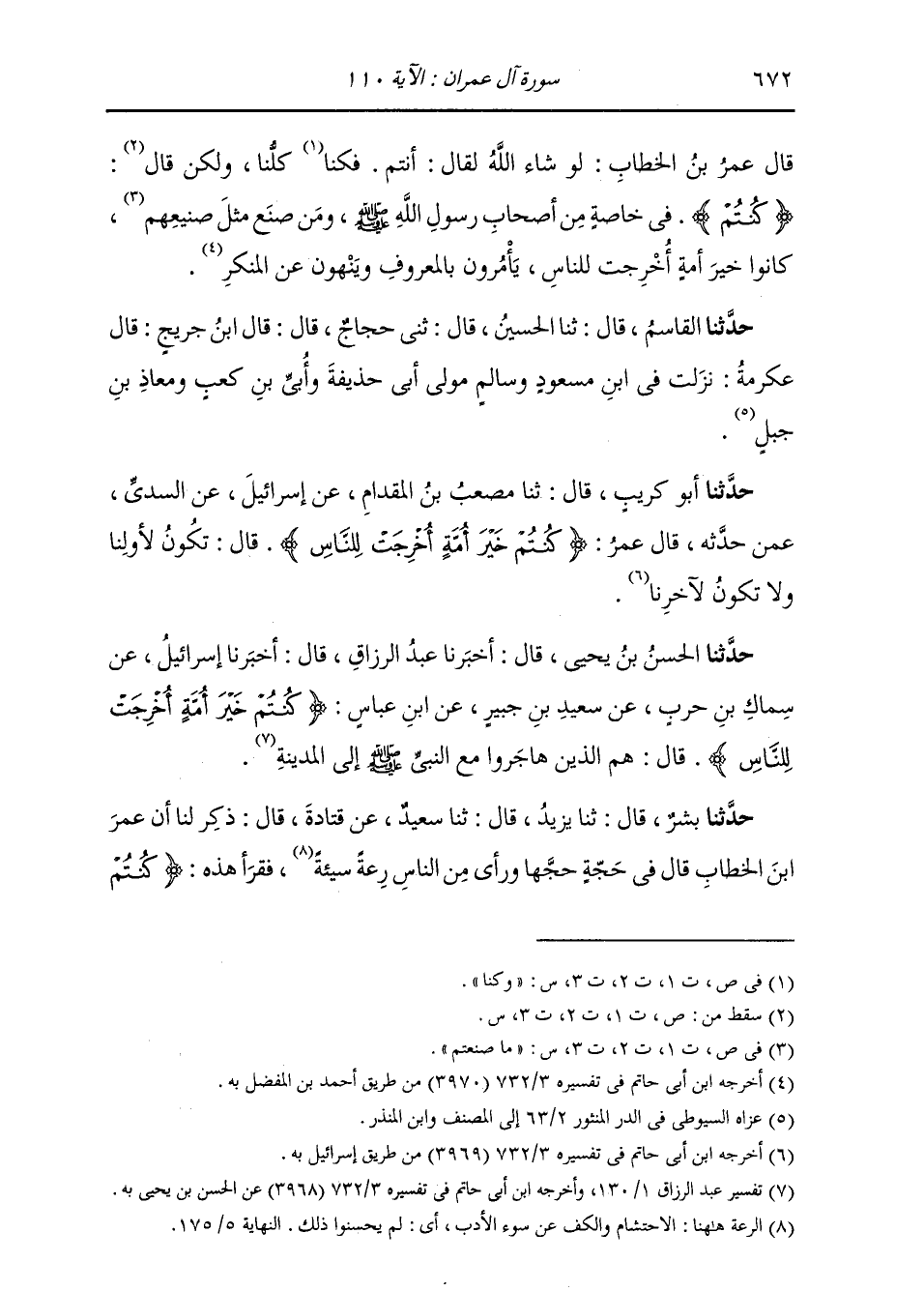 حَدَّثَنَا الْحَسَنُ بْنُ يَحْيَى، قَالَ: أَخْبَرَنَا عَبْدُ الرَّزَّاقِ، قَالَ: أَخْبَرَنَا إِسْرَائِيلُ، عَنْ سِمَاكِ بْنِ حَرْبٍ، عَنْ سَعِيدِ بْنِ جُبَيْرٍ، عَنِ ابْنِ عَبَّاسٍ: {§كُنْتُمْ خَيْرَ أُمَّةٍ أُخْرِجَتْ لِلنَّاسِ} [آل عمران: 110] قَالَ: «هُمُ الَّذِينَ هَاجَرُوا مَعَ النَّبِيِّ صَلَّى اللهُ عَلَيْهِ وَسَلَّمَ إِلَى الْمَدِينَةِ»