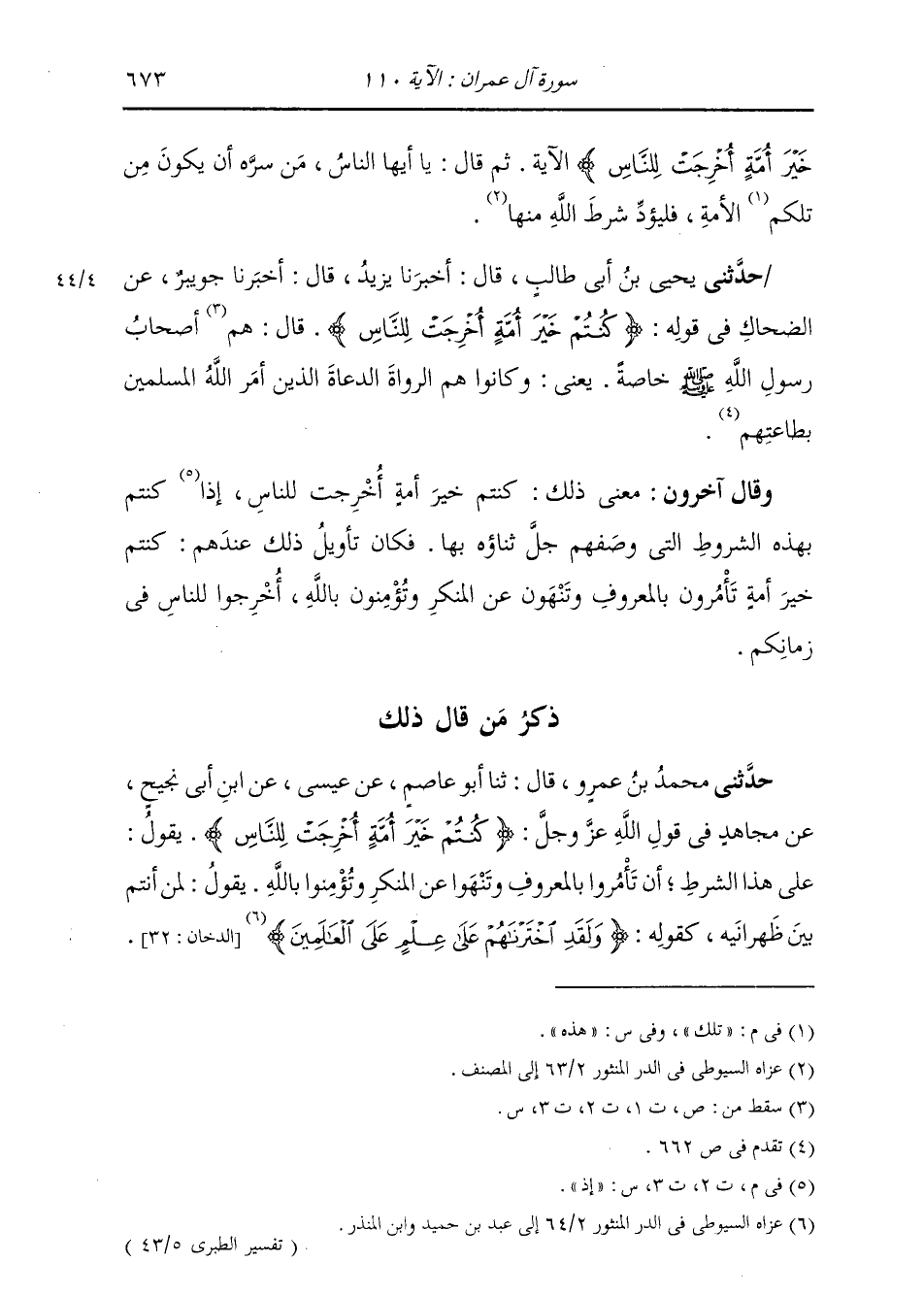 حَدَّثَنِي يَحْيَى بْنُ أَبِي طَالِبٍ، قَالَ: أَخْبَرَنَا يَزِيدُ، قَالَ: أَخْبَرَنَا جُوَيْبِرٌ، عَنِ الضَّحَّاكِ، فِي قَوْلِهِ: {§كُنْتُمْ خَيْرَ أُمَّةٍ أُخْرِجَتْ لِلنَّاسِ} [آل عمران: 110] قَالَ: «هُمْ أَصْحَابُ رَسُولِ اللَّهِ صَلَّى اللهُ عَلَيْهِ وَسَلَّمَ خَاصَّةً، يَعْنِي وَكَانُوا هُمُ الرُّوَاةَ الدُّعَاةَ الَّذِينَ أَمَرَ اللَّهُ الْمُسْلِمِينَ بِطَاعَتِهِمْ» وَقَالَ آخَرُونَ: مَعْنَى ذَلِكَ: كُنْتُمْ خَيْرَ أُمَّةٍ أُخْرِجَتْ لِلنَّاسِ، إِذْ كُنْتُمْ بِهَذِهِ الشُّرُوطِ الَّتِي وَصَفَهُمْ جَلَّ ثناؤُهُ بِهَا، فَكَانَ تَأْوِيلُ ذَلِكَ عِنْدَهُمْ: كُنْتُمْ خَيْرَ أُمَّةٍ تَأْمُرُونَ بِالْمَعْرُوفِ، وَتَنْهَوْنَ عَنِ الْمُنْكَرِ، وَتُؤْمِنُونَ بِاللَّهِ أُخْرِجُوا لِلنَّاسِ فِي زَمَانِكُمْ