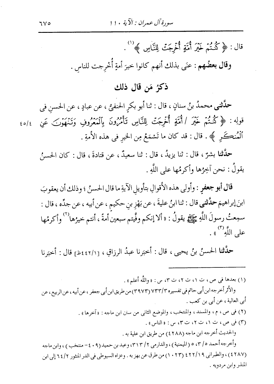 ذِكْرُ مَنْ قَالَ ذَلِكَ: حَدَّثَنِي مُحَمَّدُ بْنُ سِنَانٍ، قَالَ: ثنا أَبُو بَكْرٍ الْحَنَفِيُّ، عَنْ عَبَّادٍ، عَنِ الْحَسَنِ، فِي قَوْلِهِ: {§كُنْتُمْ خَيْرَ أُمَّةٍ أُخْرِجَتْ لِلنَّاسِ تَأْمُرُونَ بِالْمَعْرُوفِ وَتَنْهَوْنَ عَنِ الْمُنْكَرِ} [آل عمران: 110] قَالَ: «قَدْ كَانَ مَا تَسْمَعُ مِنَ الْخَيْرِ فِي هَذِهِ الْأُمَّةِ»