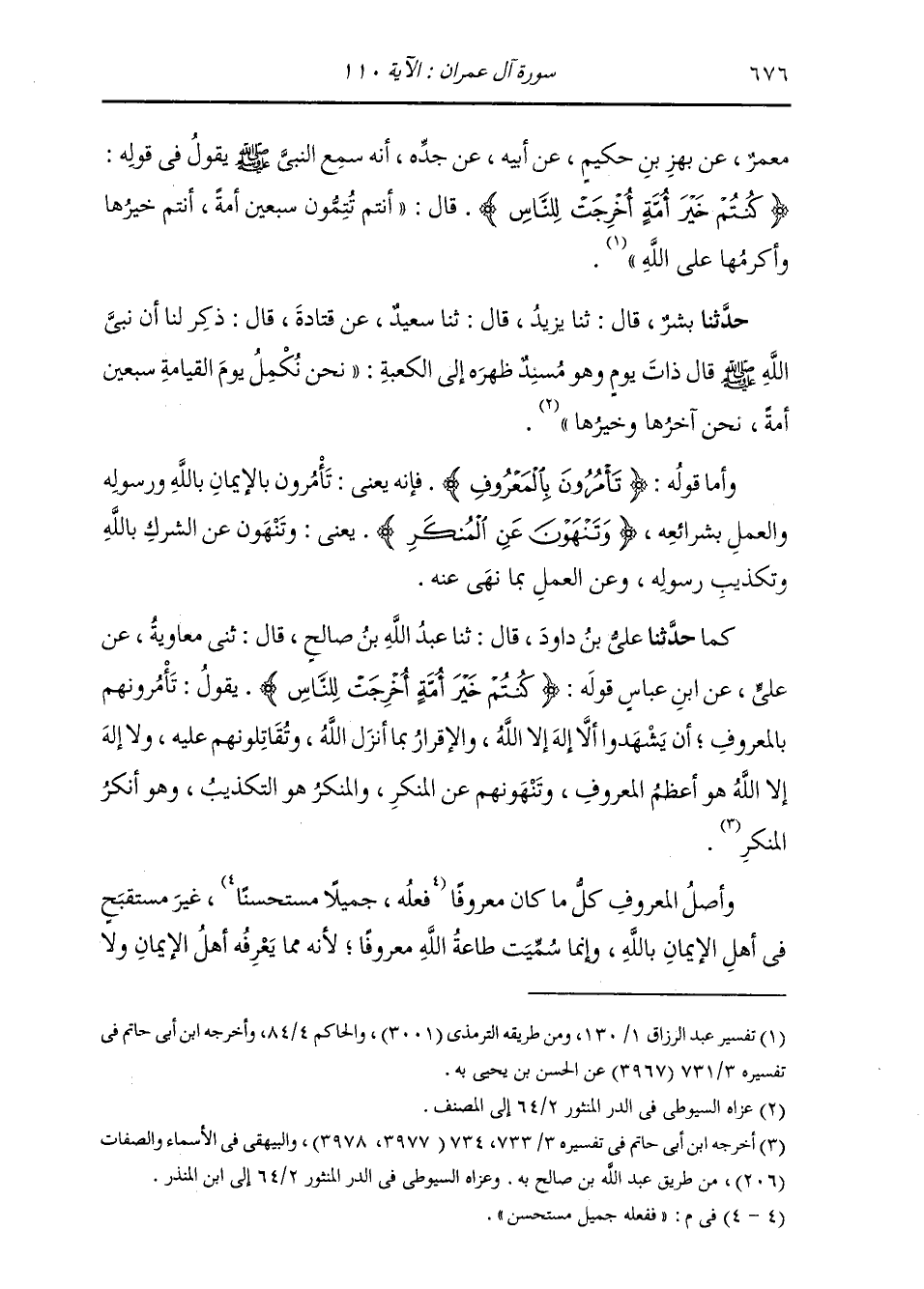 حَدَّثَنَا بِشْرٌ، قَالَ: ثنا يَزِيدُ، قَالَ: ثنا سَعِيدٌ، عَنْ قَتَادَةَ، قَالَ: ذُكِرَ لَنَا أَنَّ نَبِيَّ اللَّهِ صَلَّى اللهُ عَلَيْهِ وَسَلَّمَ قَالَ ذَاتَ يَوْمٍ، وَهُوَ مُسْنِدٌ ظَهْرَهُ إِلَى الْكَعْبَةِ: «نَحْنُ §نُكْمِلُ يَوْمَ الْقِيَامَةِ سَبْعِينَ أُمَّةٍ نَحْنُ آخِرُهَا وَخَيْرُهَا» وَأَمَّا قَوْلُهُ: {تَأْمُرُونَ بِالْمَعْرُوفِ} [آل عمران: 110] فَإِنَّهُ يَعْنِي: تَأْمُرُونَ بِالْإِيمَانِ بِاللَّهِ وَرَسُولِهِ، وَالْعَمَلِ بِشَرَائِعِهِ {وَتَنْهَوْنَ عَنِ الْمُنْكَرِ} [آل عمران: 110] يَعْنِي: وَتَنْهَوْنَ عَنِ الشِّرْكِ بِاللَّهِ، وَتَكْذِيبِ رَسُولِهِ، وَعَنِ الْعَمَلِ بِمَا نَهَى عَنْهُ