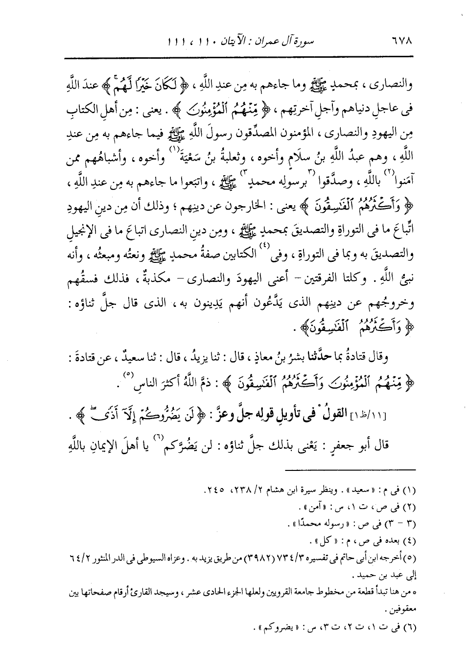 وَالنَّصَارَى بِمُحَمَّدٍ صَلَّى اللهُ عَلَيْهِ وَسَلَّمَ، وَمَا جَاءَهُمْ بِهِ مِنْ عِنْدِ اللَّهِ، لَكَانَ خَيْرًا لَهُمْ عِنْدَ اللَّهِ فِي عَاجِلِ دُنْيَاهُمْ، وَآجِلِ آخِرَتِهِمْ {مِنْهُمُ الْمُؤْمِنُونَ} [آل عمران: 110] يَعْنِي مِنْ أَهْلِ الْكِتَابِ مِنَ الْيَهُودِ وَالنَّصَارَى، الْمُؤْمِنُونَ الْمُصَدِّقُونَ رَسُولَ اللَّهِ صَلَّى اللهُ عَلَيْهِ وَسَلَّمَ فِيمَا جَاءَهُمْ بِهِ مِنْ عِنْدِ اللَّهِ، وَهُمْ عَبْدُ اللَّهِ بْنُ سَلَامٍ، وَأَخُوهُ، وَثَعْلَبَةُ بْنُ سَعْيَةَ وَأَخُوهُ، وَأَشْبَاهُهُمْ مِمَّنْ آمَنُوا بِاللَّهِ، وَصَدَّقُوا بِرَسُولِهِ مُحَمَّدٍ صَلَّى اللهُ عَلَيْهِ وَسَلَّمَ، وَاتَّبَعُوا مَا جَاءَهُمْ بِهِ مِنْ عِنْدِ اللَّهِ {وَأَكْثَرُهُمُ الْفَاسِقُونَ} [آل عمران: 110] يَعْنِي: الْخَارِجُونَ عَنْ دِينِهِمْ، وَذَلِكَ أَنَّ مِنَ دِينِ الْيَهُودِ اتِّبَاعُ مَا فِي التَّوْرَاةِ، وَالتَّصْدِيقُ بِمُحَمَّدٍ صَلَّى اللهُ عَلَيْهِ وَسَلَّمَ، وَمِنْ دِينِ النَّصَارَى اتِّبَاعُ مَا فِي الْإِنْجِيلِ، وَالتَّصْدِيقُ بِهِ وَبِمَا فِي التَّوْرَاةِ، وَفِي كِلَا الْكِتَابَيْنِ صِفَةُ مُحَمَّدٍ صَلَّى اللهُ عَلَيْهِ وَسَلَّمَ وَنَعْتُهُ، وَمَبْعَثُهُ، وَأَنَّهُ نَبِيُّ اللَّهِ، وَكِلْتَا الْفِرْقَتَيْنِ، أَعْنِي الْيَهُودَ وَالنَّصَارَى مُكَذِّبَةٌ، فَذَلِكَ فِسْقُهُمْ وَخُرُوجُهُمْ عَنْ دِينِهِمُ الَّذِي يَدَّعُونَ أَنَّهُمْ يَدِينُونَ بِهِ الَّذِي قَالَ جَلَّ ثناؤُهُ {وَأَكْثَرُهُمُ الْفَاسِقُونَ} [آل عمران: 110] وَقَالَ قَتَادَةُ