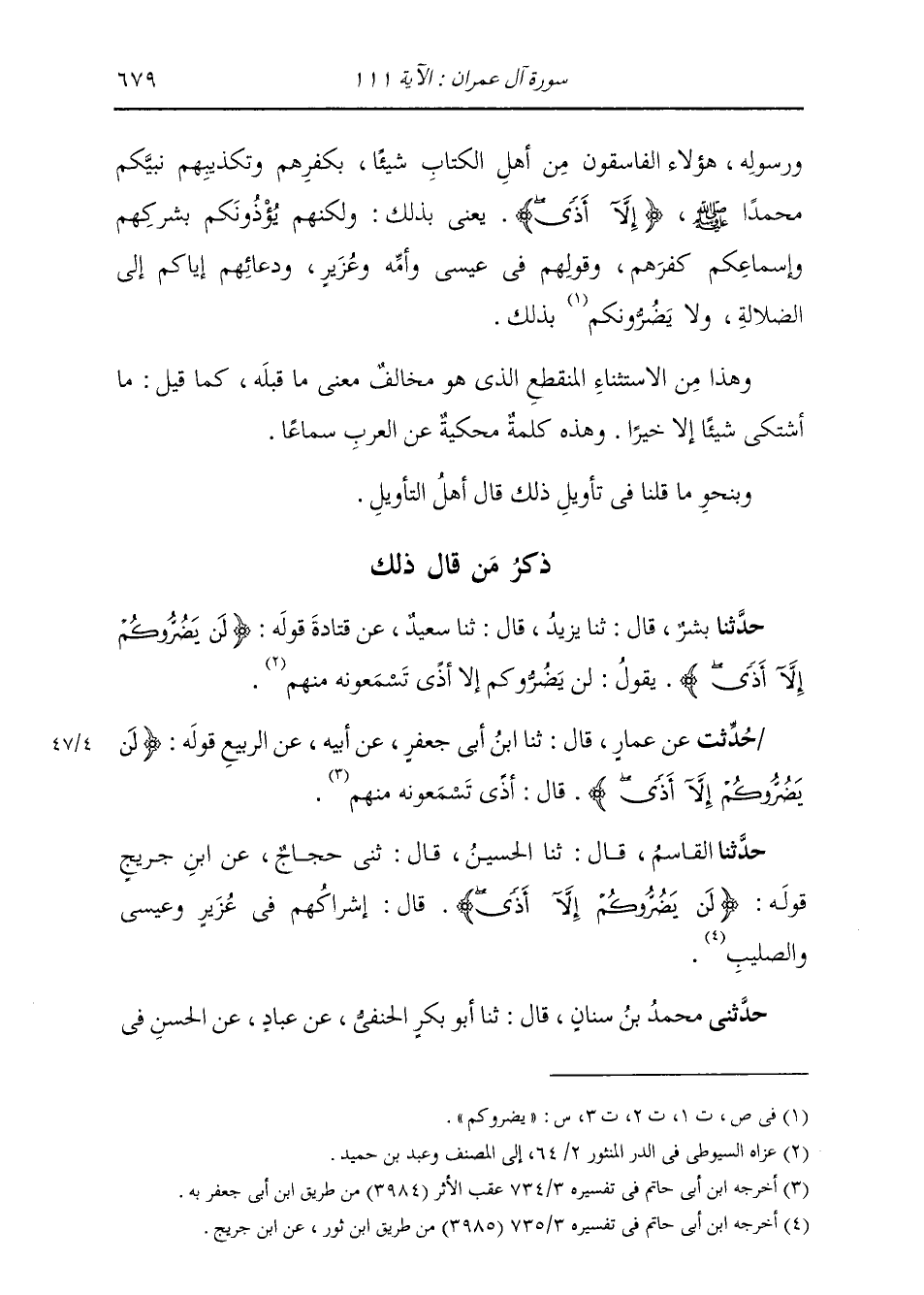 ذِكْرُ مَنْ قَالَ ذَلِكَ: حَدَّثَنَا بِشْرٌ، قَالَ: ثنا يَزِيدُ، قَالَ: ثنا سَعِيدٌ، عَنْ قَتَادَةَ، قَوْلُهُ: {§لَنْ يَضُرُّوكُمْ إِلَّا أَذًى} [آل عمران: 111] يَقُولُ: «لَنْ يَضُرُّوكُمْ إِلَّا أَذًى تَسْمَعُونَهُ مِنْهُمْ»