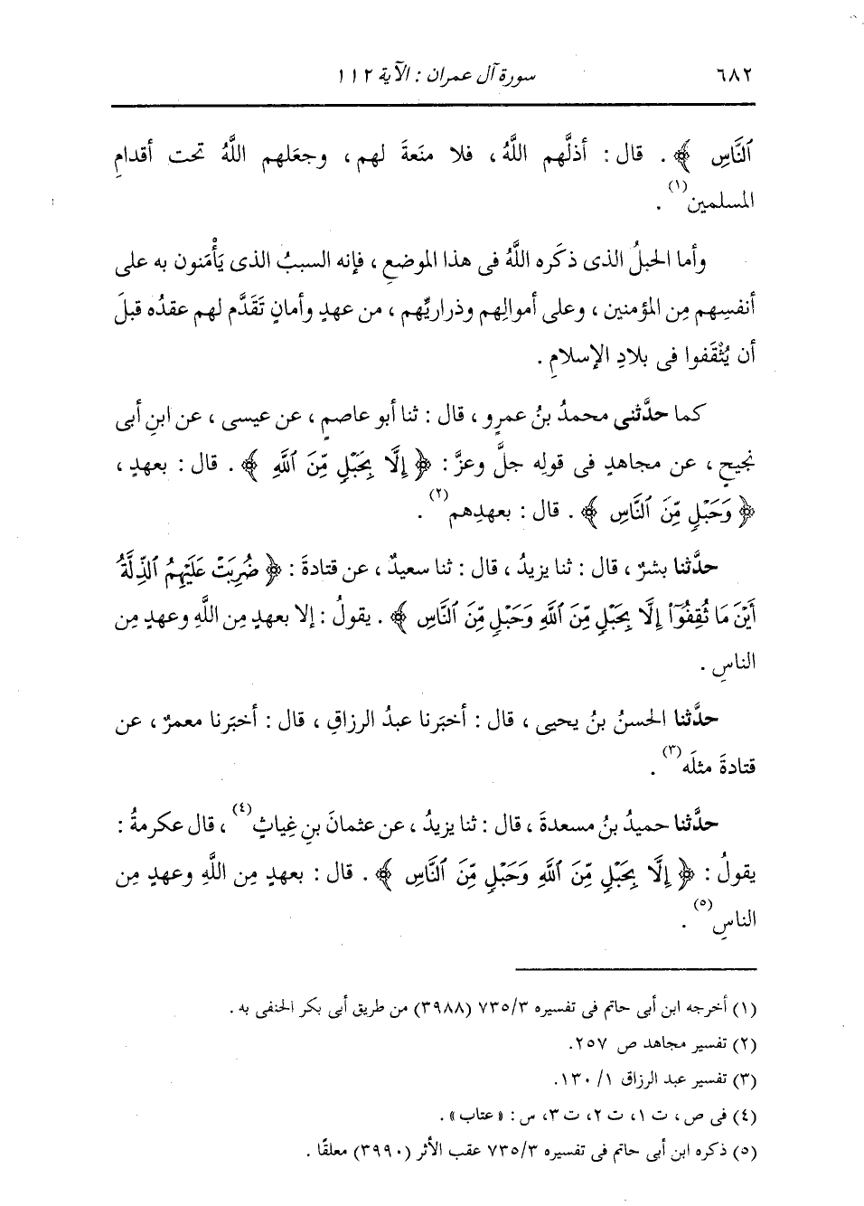 حَدَّثَنَا بِشْرٌ، قَالَ: ثنا يَزِيدُ، قَالَ: ثنا سَعِيدٌ، عَنْ قَتَادَةَ: {§ضُرِبَتْ عَلَيْهِمُ الذِّلَّةُ أَيْنَمَا ثُقِفُوا إِلَّا بِحَبْلٍ مِنَ اللَّهِ وَحَبْلٍ مِنَ النَّاسِ} يَقُولُ: «إِلَّا بِعَهْدٍ مِنَ اللَّهِ، وَعَهْدٍ مِنَ النَّاسِ» حَدَّثَنَا الْحَسَنُ بْنُ يَحْيَى، قَالَ: أَخْبَرَنَا عَبْدُ الرَّزَّاقِ، قَالَ: أَخْبَرَنَا مَعْمَرٌ، عَنْ قَتَادَةَ، مِثْلَهُ