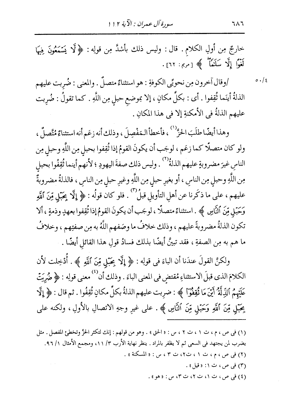 خَارِجٌ مِنْ أَوَّلِ الْكَلَامِ، قَالَ: وَلَيْسَ ذَلِكَ بِأَشَدَّ مِنْ قَوْلِهِ: {لَا يَسْمَعُونَ فِيهَا لَغْوًا إِلَّا سَلَامًا} [مريم: 62] ، وَقَالَ آخَرُونَ مِنْ نَحْوِيِّيِ الْكُوفَةِ: هُوَ اسْتِثْنَاءٌ مُتَّصِلٌ، وَالْمَعْنَى: ضُرِبَتْ عَلَيْهِمُ الذِّلَّةُ أَيْنَمَا ثُقِفُوا: أَيْ بِكُلِّ مَكَانٍ، إِلَّا بِمَوْضِعِ حَبْلٍ مِنَ اللَّهِ، كَمَا تَقُولُ: ضُرِبَتْ عَلَيْهِمُ الذِّلَّةُ فِي الْأَمْكِنَةِ إِلَّا فِي هَذَا الْمَكَانِ، وَهَذَا أَيْضًا طَلَبَ الْحَقَّ، فَأَخْطَأَ الْمُفَصَّلَ، وَذَلِكَ أَنَّهُ زَعَمَ أَنَّهُ اسْتِثْنَاءٌ مُتَّصِلٌ، وَلَوْ كَانَ مُتَّصِلًا كَمَا زَعَمَ لَوَجَبَ أَنْ يَكُونَ الْقَوْمُ إِذَا ثُقِفُوا بِحَبْلٍ مِنَ اللَّهِ وَحَبْلٍ مِنَ النَّاسِ غَيْرَ مَضْرُوبَةٍ عَلَيْهِمُ الْمَسْكَنَةُ، وَلَيْسَ ذَلِكَ صِفَةَ الْيَهُودِ؛ لِأَنَّهُمْ أَيْنَمَا ثُقِفُوا بِحَبْلٍ مِنَ اللَّهِ وَحَبْلٍ مِنَ النَّاسِ، أَوْ بِغَيْرِ حَبْلٍ مِنَ اللَّهِ عَزَّ وَجَلَّ، وَغَيْرِ حَبْلٍ مِنَ النَّاسِ، فَالذِّلَّةُ مَضْرُوبَةٌ عَلَيْهِمْ عَلَى مَا ذَكَرْنَا عَنْ أَهْلِ التَّأْوِيلِ قَبْلُ، فَلَوْ كَانَ قَوْلُهُ: {إِلَّا بِحَبْلٍ مِنَ اللَّهِ وَحَبْلٍ مِنَ النَّاسِ} [آل عمران: 112] اسْتِثْنَاءً مُتَّصِلًا لَوَجَبَ أَنْ يَكُونَ الْقَوْمُ إِذَا ثُقِفُوا بِعَهْدٍ وَذِمَّةٍ أَنْ لَا تَكُونَ الذِّلَّةُ مَضْرُوبَةً عَلَيْهِمْ. وَذَلِكَ خِلَافُ مَا وَصَفَهُمُ اللَّهُ بِهِ مِنْ صِفَتِهِمْ، وَخِلَافُ مَا هُمْ بِهِ مِنَ الصِّفَةِ، فَقَدْ تَبَيَّنَ أَيْضًا بِذَلِكَ فَسَادُ قَوْلِ هَذَا الْقَائِلِ أَيْضًا، وَلَكِنَّ الْقَوْلَ عِنْدَنَا أَنَّ الْبَاءَ فِي قَوْلِهِ: {إِلَّا بِحَبْلٍ مِنَ اللَّهِ} [آل عمران: 112] أُدْخِلَتْ لِأَنَّ الْكَلَامَ الَّذِي قَبْلَ الِاسْتِثْنَاءِ مُقْتَضٍ فِي الْمَعْنَى الْبَاءَ، وَذَلِكَ أَنَّ مَعْنَى قَوْلِهِمْ: {ضُرِبَتْ عَلَيْهِمُ الذِّلَّةُ أَيْنَمَا ثُقِفُوا} ضُرِبَتْ عَلَيْهِمُ الذِّلَّةُ بِكُلِّ مَكَانٍ ثُقِفُوا، ثُمَّ قَالَ: {إِلَّا بِحَبْلٍ مِنَ اللَّهِ وَحَبْلٍ مِنَ النَّاسِ} [آل عمران: 112] عَلَى غَيْرِ وَجْهِ الِاتِّصَالِ بِالْأَوَّلِ، وَلَكِنَّهُ عَلَى