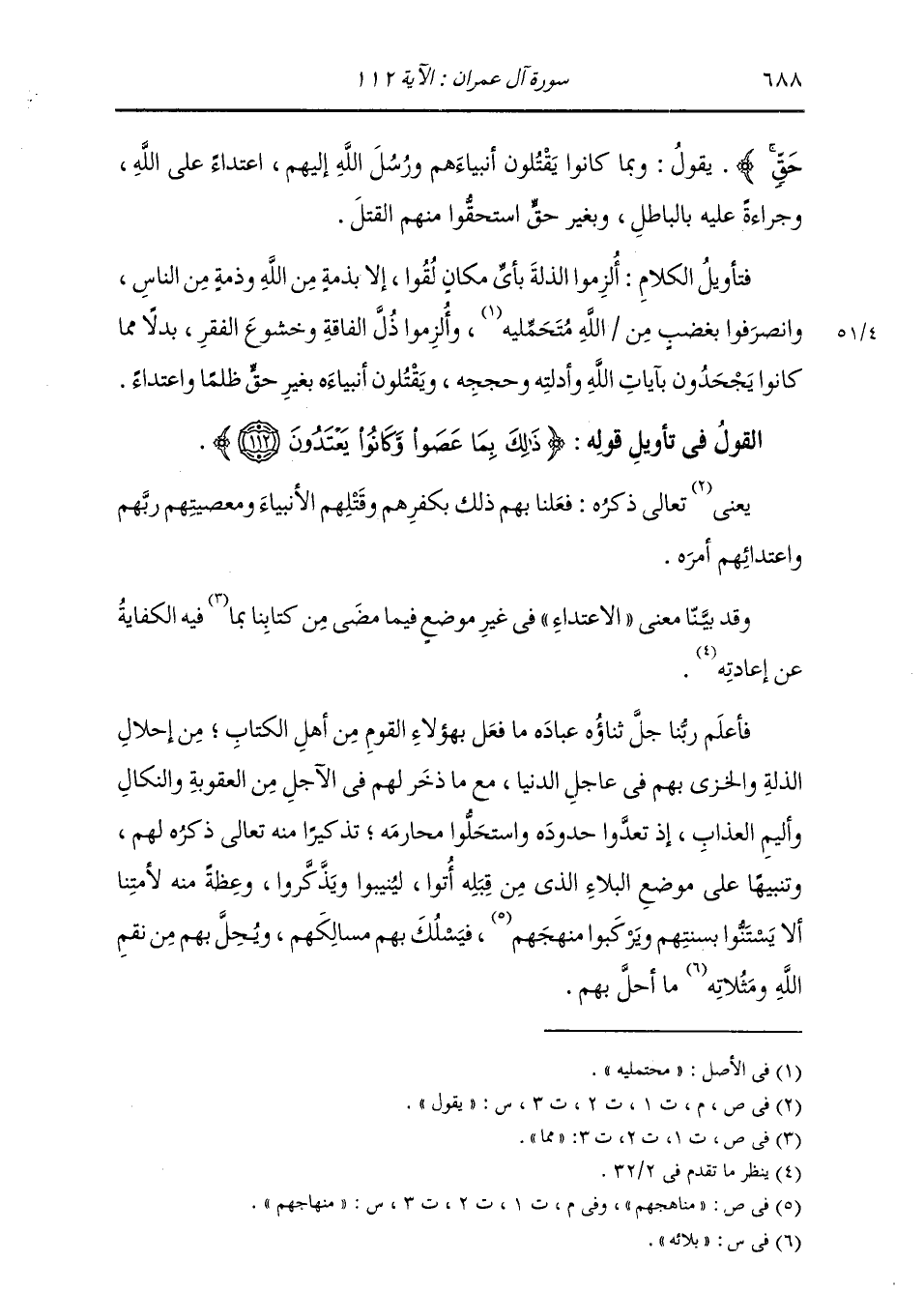 حَقٍّ} [آل عمران: 112] يَقُولُ: وَبِمَا كَانُوا يَقْتُلُونَ أَنْبِيَاءَهُمْ وَرُسُلَ اللَّهِ إِلَيْهِمْ، اعْتِدَاءً عَلَى اللَّهِ، وَجَرَاءَةً عَلَيْهِ بِالْبَاطِلِ، وَبِغَيْرِ حَقٍّ اسْتَحَقُّوا مِنْهُمُ الْقَتْلَ. فَتَأْوِيلُ الْكَلَامِ: أُلْزِمُوا الذِّلَّةَ بِأَيِّ مَكَانٍ لُقُوا إِلَّا بِذِمَّةٍ مِنَ اللَّهِ وَذِمَّةٍ مِنَ النَّاسِ، وَانْصَرَفُوا بِغَضَبٍ مِنَ اللَّهِ مُتَحَمِّلِيهِ، وَأُلْزِمُوا ذُلَّ الْفَاقَةِ، وَخُشُوعَ الْفَقْرِ، بَدَلًا مِمَّا كَانُوا يَجْحَدُونَ بِآيَاتِ اللَّهِ، وَأَدِلَّتِهِ وَحُجَجِهِ وَيَقْتُلُونَ أَنْبِيَاءَهُ بِغَيْرِ حَقٍّ ظُلْمًا وَاعْتِدَاءً