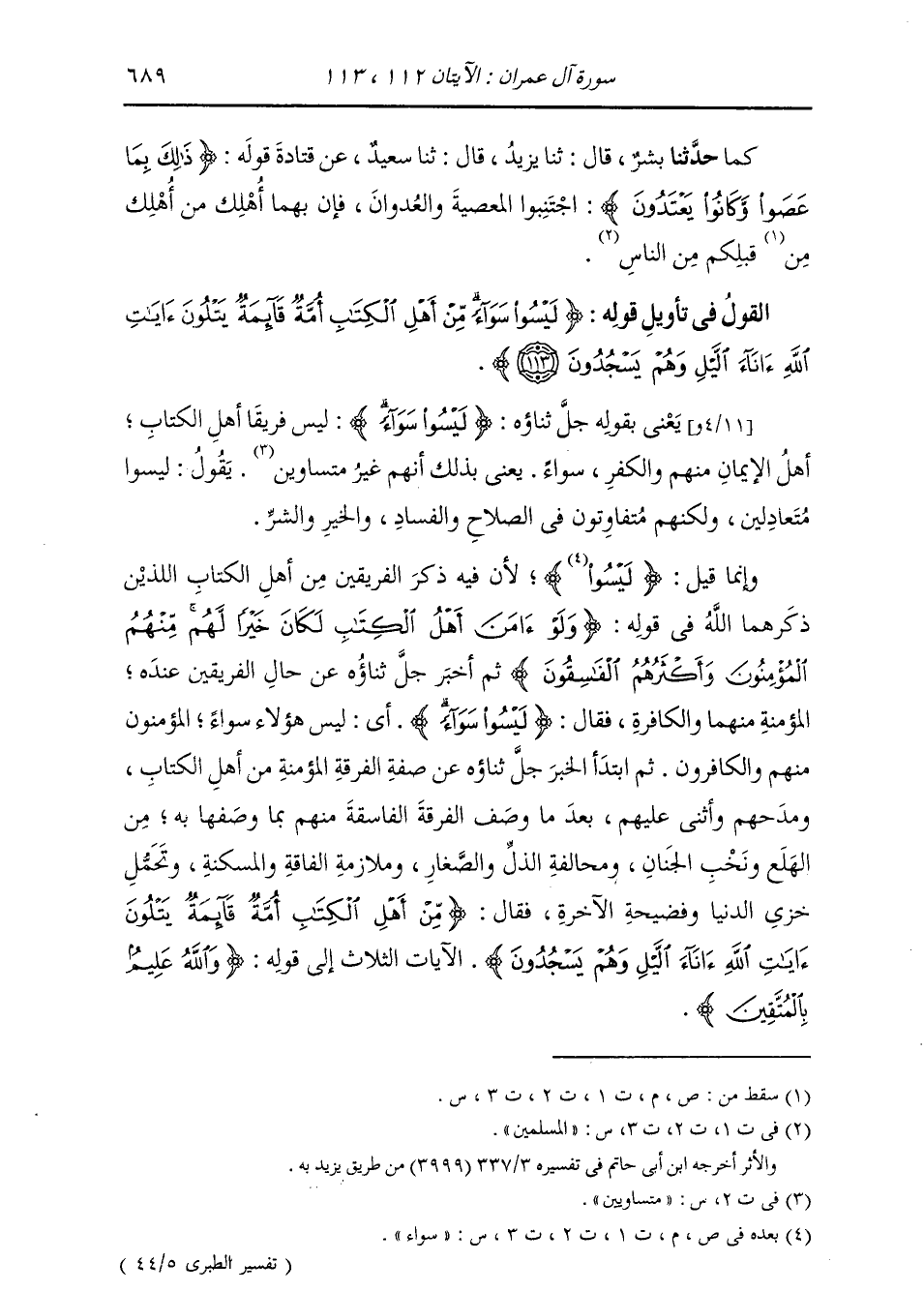 §الْقَوْلُ فِي تَأْوِيلِ قَوْلِهِ تَعَالَى: {لَيْسُوا سَوَاءً مِنْ أَهْلِ الْكِتَابِ أُمَّةٌ قَائِمَةٌ يَتْلُونَ آيَاتِ اللَّهِ آنَاءَ اللَّيْلِ وَهُمْ يَسْجُدُونَ} [آل عمران: 113] يَعْنِي بِقَوْلِهِ جَلَّ ثناؤُهُ: {لَيْسُوا سَوَاءً} [آل عمران: 113] لَيْسَ فَرِيقَا أَهْلِ الْكِتَابِ، أَهْلُ الْإِيمَانِ مِنْهُمْ وَالْكُفْرِ سَوَاءً، يَعْنِي بِذَلِكَ: أَنَّهُمْ غَيْرُ مُتَسَاوِينَ، يَقُولُ: لَيْسُوا مُتَعَادِلِينَ، وَلَكِنَّهُمْ مُتَفَاوِتُونَ فِي الصَّلَاحِ وَالْفَسَادِ وَالْخَيْرِ وَالشَّرِّ. وَإِنَّمَا قِيلَ: لَيْسُوا سَوَاءً؛ لِأَنَّ فِيهِ ذِكْرَ الْفَرِيقَيْنِ مِنْ أَهْلِ الْكِتَابِ اللَّذَيْنِ ذَكَرَهُمَا اللَّهُ فِي قَوْلِهِ: {وَلَوْ آمَنَ أَهْلُ الْكِتَابِ لَكَانَ خَيْرًا لَهُمْ مِنْهُمُ الْمُؤْمِنُونَ وَأَكْثَرُهُمُ الْفَاسِقُونَ} [آل عمران: 110] ، ثُمَّ أَخْبَرَ جَلَّ ثناؤُهُ عَنْ حَالِ الْفَرِيقَيْنِ، عِنْدَهُ، الْمُؤْمِنَةِ مِنْهُمَا وَالْكَافِرَةِ، فَقَالَ: {لَيْسُوا سَوَاءً} [آل عمران: 113] أَيْ لَيْسَ هَؤُلَاءِ سَوَاءً، الْمُؤْمِنُونَ مِنْهُمْ وَالْكَافِرُونَ، ثُمَّ ابْتَدَأَ الْخَبَرَ جَلَّ ثناؤُهُ عَنْ صِفَةِ الْفِرْقَةِ الْمُؤْمِنَةِ مِنْ أَهْلِ الْكِتَابِ وَمَدَحَهُمْ وَأَثْنَى عَلَيْهِمْ بَعْدَمَا وَصَفَ الْفِرْقَةَ الْفَاسِقَةَ مِنْهُمْ بِمَا وَصَفَهَا بِهِ مِنَ الْهَلَعِ وَنَخْبِ الْجَنَانِ، وَمُحَالَفَةِ الذُّلِّ وَالصَّغَارِ، وَمُلَازَمَةِ الْفَاقَةِ وَالْمَسْكَنَةِ، وَتَحَمُّلِ خِزْيِ الدُّنْيَا وَفَضِيَحِةِ الْآخِرَةِ، فَقَالَ: {مِنْ أَهْلِ الْكِتَابِ أُمَّةٌ قَائِمَةٌ يَتْلُونَ آيَاتِ اللَّهِ آنَاءَ اللَّيْلِ وَهُمْ يَسْجُدُونَ} [آل عمران: 113] الْآيَاتِ الثَّلَاثِ، إِلَى قَوْلِهِ: {وَاللَّهُ عَلِيمٌ بِالْمُتَّقِينَ} [آل عمران: 115]