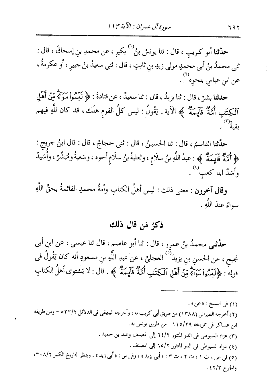 حَدَّثَنَا الْقَاسِمُ، قَالَ: ثنا الْحُسَيْنُ، قَالَ: ثني حَجَّاجٌّ، قَالَ: قَالَ ابْنُ جُرَيْجٍ: {§أُمَّةٌ قَائِمَةٌ} [آل عمران: 113] «عَبْدُ اللَّهِ بْنُ سَلَامٍ، وَثَعْلَبَةُ بْنُ سَلَامٍ أَخُوهُ، وَسَعْيَةُ، وَمُبَشِّرٌ، وَأُسَيْدٌ وَأَسَدٌ ابْنَا كَعْبٍ» وَقَالَ آخَرُونَ: مَعْنَى ذَلِكَ: لَيْسَ أَهْلُ الْكِتَابِ وَأَمَةُ مُحَمَّدٍ الْقَائِمَةُ بِحَقِّ اللَّهِ سَوَاءً عِنْدَ اللَّهِ