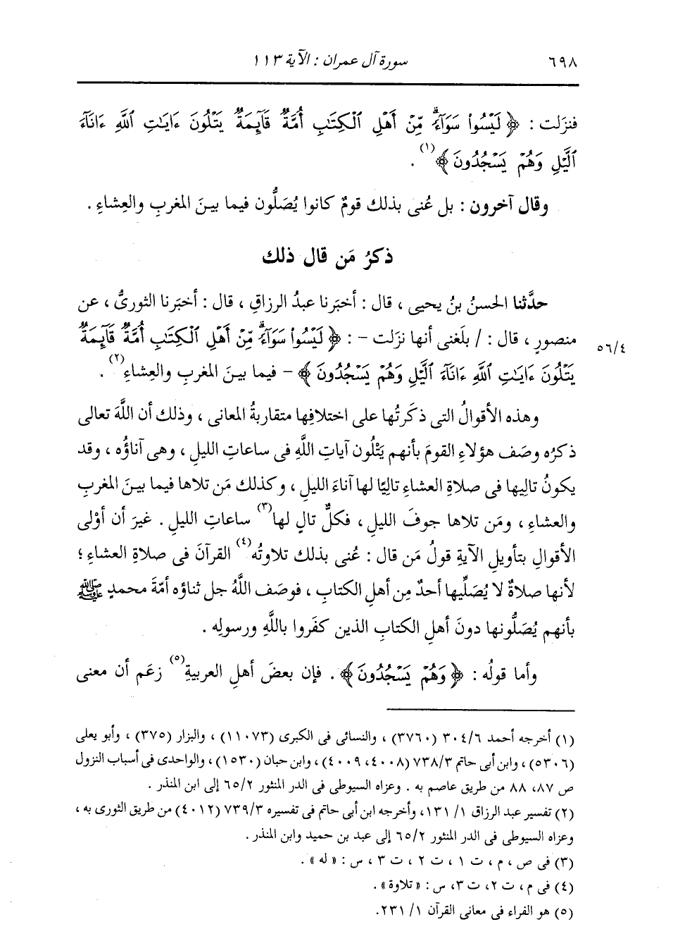 ذِكْرُ مَنْ قَالَ ذَلِكَ: حَدَّثَنَا الْحَسَنُ بْنُ يَحْيَى، قَالَ: أَخْبَرَنَا عَبْدُ الرَّزَّاقِ، قَالَ: أَخْبَرَنَا الثَّوْرِيُّ، عَنْ مَنْصُورٍ، قَالَ: بَلَغَنِي أَنَّهَا نَزَلَتْ: {§لَيْسُوا سَوَاءً مِنْ أَهْلِ الْكِتَابِ أُمَّةٌ قَائِمَةٌ يَتْلُونَ آيَاتِ اللَّهِ آنَاءَ اللَّيْلِ وَهُمْ يَسْجُدُونَ} [آل عمران: 113] «فِيمَا بَيْنَ الْمَغْرِبِ وَالْعِشَاءِ» وَهَذِهِ الْأَقْوَالُ الَّتِي ذَكَرْتُهَا عَلَى اخْتِلَافِهَا مُتَقَارِبَةُ الْمَعَانِي، وَذَلِكَ أَنَّ اللَّهَ تَعَالَى ذِكْرُهُ، وَصَفَ هَؤُلَاءِ الْقَوْمَ، بِأَنَّهُمْ يَتْلُونَ آيَاتِ اللَّهِ فِي سَاعَاتِ اللَّيْلِ، وَهِيَ آنَاؤُهُ، وَقَدْ يَكُونُ تَالِيهَا فِي صَلَاةِ الْعِشَاءِ تَالِيًا لَهَا آنَاءَ اللَّيْلِ، وَكَذَلِكَ مَنْ تَلَاهَا فِيمَا بَيْنَ الْمَغْرِبِ وَالْعِشَاءِ، وَمَنْ تَلَاهَا جَوْفَ اللَّيْلِ، فَكُلُّ تَالٍ لَهُ سَاعَاتَ اللَّيْلِ غَيْرَ أَنَّ أَوْلَى الْأَقْوَالِ بِتَأْوِيلِ الْآيَةَ قَوْلُ مَنْ قَالَ: عُنِيَ بِذَلِكَ تِلَاوَةُ الْقُرْآنِ فِي صَلَاةِ الْعِشَاءِ؛ لِأَنَّهَا صَلَاةٌ لَا يُصَلِّيَهَا أَحَدٌ مِنْ أَهْلِ الْكِتَابِ، فَوَصَفَ اللَّهُ أُمَّةَ مُحَمَّدٍ صَلَّى اللهُ عَلَيْهِ وَسَلَّمَ بِأَنَّهُمْ يُصَلُّونَهَا دُونَ أَهْلِ الْكِتَابِ الَّذِينَ كَفَرُوا بِاللَّهِ وَرَسُولِهِ. وَأَمَّا قَوْلُهُ: {وَهُمْ يَسْجُدُونَ} [آل عمران: 113] فَإِنَّ بَعْضَ أَهْلِ الْعَرَبِيَّةِ زَعَمَ أَنَّ مَعْنَى -[699]- السُّجُودِ فِي هَذَا الْمَوْضِعِ اسْمُ الصَّلَاةِ لَا السُّجُودُ؛ لِأَنَّ التِّلَاوَةَ لَا تَكُونُ فِي السُّجُودِ وَلَا فِي الرُّكُوعِ، فَكَانَ مَعْنَى الْكَلَامِ عِنْدَهُ: يَتْلُونَ آيَاتِ اللَّهِ آنَاءَ اللَّيْلِ وَهُمْ يُصَلُّونَ، وَلَيْسَ الْمَعْنَى عَلَى مَا ذَهَبَ إِلَيْهِ، وَإِنَّمَا مَعْنَى الْكَلَامِ: مِنْ أَهْلِ الْكِتَابِ أُمَّةٌ قَائِمَةٌ، يَتْلُونَ آيَاتِ اللَّهِ آنَاءَ اللَّيْلِ فِي صَلَاتِهِمْ، وَهُمْ مَعَ ذَلِكَ يَسْجُدُونَ فِيهَا، فَالسُّجُودُ هُوَ السُّجُودُ الْمَعْرُوفُ فِي الصَّلَاةِ