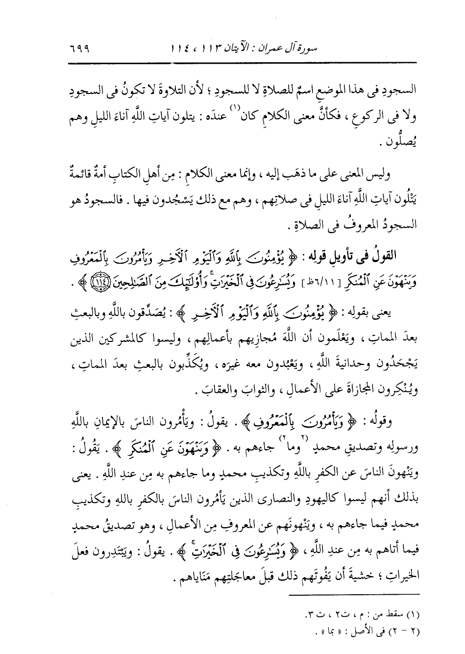 §الْقَوْلُ فِي تَأْوِيلِ قَوْلِهِ تَعَالَى: {يُؤْمِنُونَ بِاللَّهِ وَالْيَوْمِ الْآخِرِ وَيَأْمُرُونَ بِالْمَعْرُوفِ وَيَنْهَوْنَ عَنِ الْمُنْكَرِ وَيُسَارِعُونَ فِي الْخَيْرَاتِ وَأُولَئِكَ مِنَ الصَّالِحِينَ} [آل عمران: 114] يَعْنِي بِقَوْلِهِ جَلَّ وَعَزَّ: {يُؤْمِنُونَ بِاللَّهِ وَالْيَوْمِ الْآخِرِ} [آل عمران: 114] يُصَدِّقُونَ بِاللَّهِ، وَبِالْبَعْثِ بَعْدَ الْمَمَاتِ، وَيَعْلَمُونَ أَنَّ اللَّهَ مُجَازِيهِمْ بِأَعْمَالِهِمْ؛ وَلَيْسُوا كَالْمُشْرِكِينَ الَّذِينَ يَجْحَدُونَ وَحْدَانِيَّةَ اللَّهِ، وَيَعْبُدُونَ مَعَهُ غَيْرَهُ، وَيُكَذِّبُونَ بِالْبَعْثِ بَعْدَ الْمَمَاتِ، وَيُنْكِرُونَ الْمُجَازَاةَ عَلَى الْأَعْمَالِ وَالثَّوَابَ وَالْعِقَابَ، وَقَوْلُهُ: {وَيَأْمُرُونَ بِالْمَعْرُوفِ} [آل عمران: 104] يَقُولُ: يَأْمُرُونَ النَّاسَ بِالْإِيمَانِ بِاللَّهِ وَرَسُولِهِ، وَتَصْدِيقِ مُحَمَّدٍ صَلَّى اللهُ عَلَيْهِ وَسَلَّمَ، وَمَا جَاءَهُمْ بِهِ. {وَيَنْهَوْنَ عَنِ الْمُنْكَرِ} [آل عمران: 104] يَقُولُ: وَيَنْهَوْنَ النَّاسَ عَنِ الْكُفْرِ بِاللَّهِ، وَتَكْذِيبِ مُحَمَّدٍ، وَمَا جَاءَهُمْ بِهِ مِنْ عِنْدِ اللَّهِ: يَعْنِي بِذَلِكَ: أَنَّهُمْ لَيْسُوا كَالْيَهُودِ وَالنَّصَارَى، الَّذِينَ يَأْمُرُونَ النَّاسَ بِالْكُفْرِ، وَتَكْذِيبِ مُحَمَّدٍ فِيمَا جَاءَهُمْ بِهِ، وَيَنْهَوْنَهُمْ عَنِ الْمَعْرُوفِ مِنَ الْأَعْمَالِ، وَهُوَ تَصْدِيقُ مُحَمَّدٍ فِيمَا أَتَاهُمْ بِهِ مِنْ عِنْدِ اللَّهِ {وَيُسَارِعُونَ فِي الْخَيْرَاتِ} [آل عمران: 114] يَقُولُ: وَيَبْتَدِرُونَ فِعْلَ الْخَيْرَاتِ خَشْيَةَ أَنْ يَفُوتَهُمْ ذَلِكَ قَبْلَ مُعَاجَلَتِهِمْ مَنَايَاهُمْ.