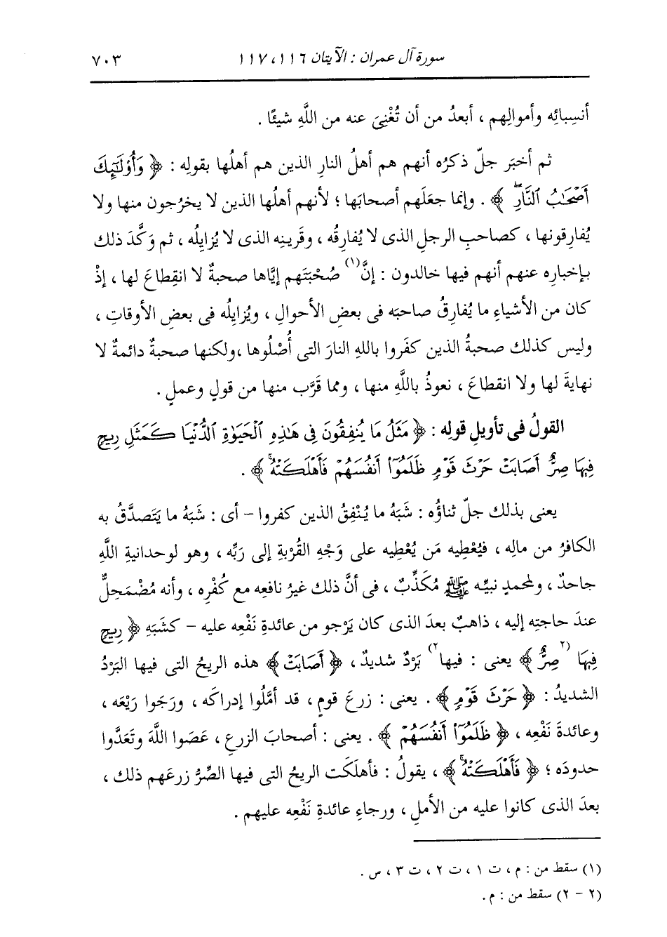 §الْقَوْلُ فِي تَأْوِيلِ قَوْلِهِ تَعَالَى: {مَثَلُ مَا يُنْفِقُونَ فِي هَذِهِ الْحَيَاةِ الدُّنْيَا كَمَثَلِ رِيحٍ فِيهَا صِرٌّ أَصَابَتْ حَرْثَ قَوْمٍ ظَلَمُوا أَنْفُسَهُمْ فَأَهْلَكَتْهُ وَمَا ظَلَمَهُمُ اللَّهُ وَلَكِنْ أَنْفُسَهُمْ يَظْلِمُونَ} [آل عمران: 117] يَعْنِي بِذَلِكَ جَلَّ ثناؤُهُ: شِبْهُ مَا يُنْفِقُ الَّذِينَ كَفَرُوا: أَيْ شِبْهُ مَا يَتَصَدَّقُ بِهِ الْكَافِرُ مِنْ مَالِهِ، فَيُعْطِيهِ مَنْ يُعْطِيهِ عَلَى وَجْهِ الْقُرْبَةِ إِلَى رَبِّهِ، وَهُوَ لِوَحْدَانِيَّةِ اللَّهِ جَاحِدٌ وَلِمُحَمَّدٍ صَلَّى اللهُ عَلَيْهِ وَسَلَّمَ مُكَذِّبٌ فِي أَنَّ ذَلِكَ غَيْرُ نَافِعِهِ مَعَ كُفْرِهِ، وَأَنَّهُ مُضْمَحِلٌّ عِنْدَ حَاجَتِهِ إِلَيْهِ ذَاهِبٌ بَعْدَ الَّذِي كَانَ يَرْجُو مِنْ عَائِدَةِ نَفْعِهِ عَلَيْهِ، كَشِبْهِ رِيحٍ فِيهَا بَرْدٌ شَدِيدٌ {أَصَابَتْ} [آل عمران: 117] هَذِهِ الرِّيحُ الَّتِي فِيهَا الْبَرْدُ الشَّدِيدُ {حَرْثَ قَوْمٍ} [آل عمران: 117] يَعْنِي زَرْعَ قَوْمٍ، قَدْ أَمَّلُوا إِدْرَاكَهُ، وَرَجَوْا رِيعَهُ وَعَائِدَةَ نَفْعِهِ، {ظَلَمُوا أَنْفُسَهُمْ} [آل عمران: 117] يَعْنِي أَصْحَابَ الزَّرْعِ، عَصَوُا اللَّهَ، وَتَعَدَّوْا حُدُودَهُ {فَأَهْلَكَتْهُ} [آل عمران: 117] يَعْنِي فَأَهْلَكَتِ الرِّيحُ الَّتِي فِيهَا الصِّرُّ زَرْعَهُمْ ذَلِكَ، بَعْدَ الَّذِي كَانُوا عَلَيْهِ مِنَ الْأَمَلِ، وَرَجَاءَ عَائِدَةِ نَفْعِهِ عَلَيْهِمْ،