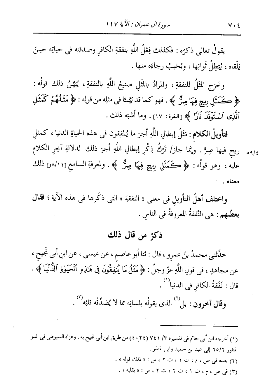 ذِكْرُ مَنْ قَالَ ذَلِكَ: حَدَّثَنِي مُحَمَّدُ بْنُ عَمْرٍو، قَالَ ثنا أَبُو عَاصِمٍ، عَنْ عِيسَى، عَنِ ابْنِ أَبِي نَجِيحٍ، عَنْ مُجَاهِدٍ، فِي قَوْلِ اللَّهِ عَزَّ وَجَلَّ: {§مَثَلُ مَا يُنْفِقُونَ فِي هَذِهِ الْحَيَاةِ الدُّنْيَا} [آل عمران: 117] قَالَ: «نَفَقَةُ الْكَافِرِ فِي الدُّنْيَا» وَقَالَ آخَرُونَ: بَلْ ذَلِكَ قَوْلُهُ الَّذِي يَقُولُهُ بِلِسَانِهِ مِمَّا لَا يُصَدِّقُهُ بِقَلْبِهِ
