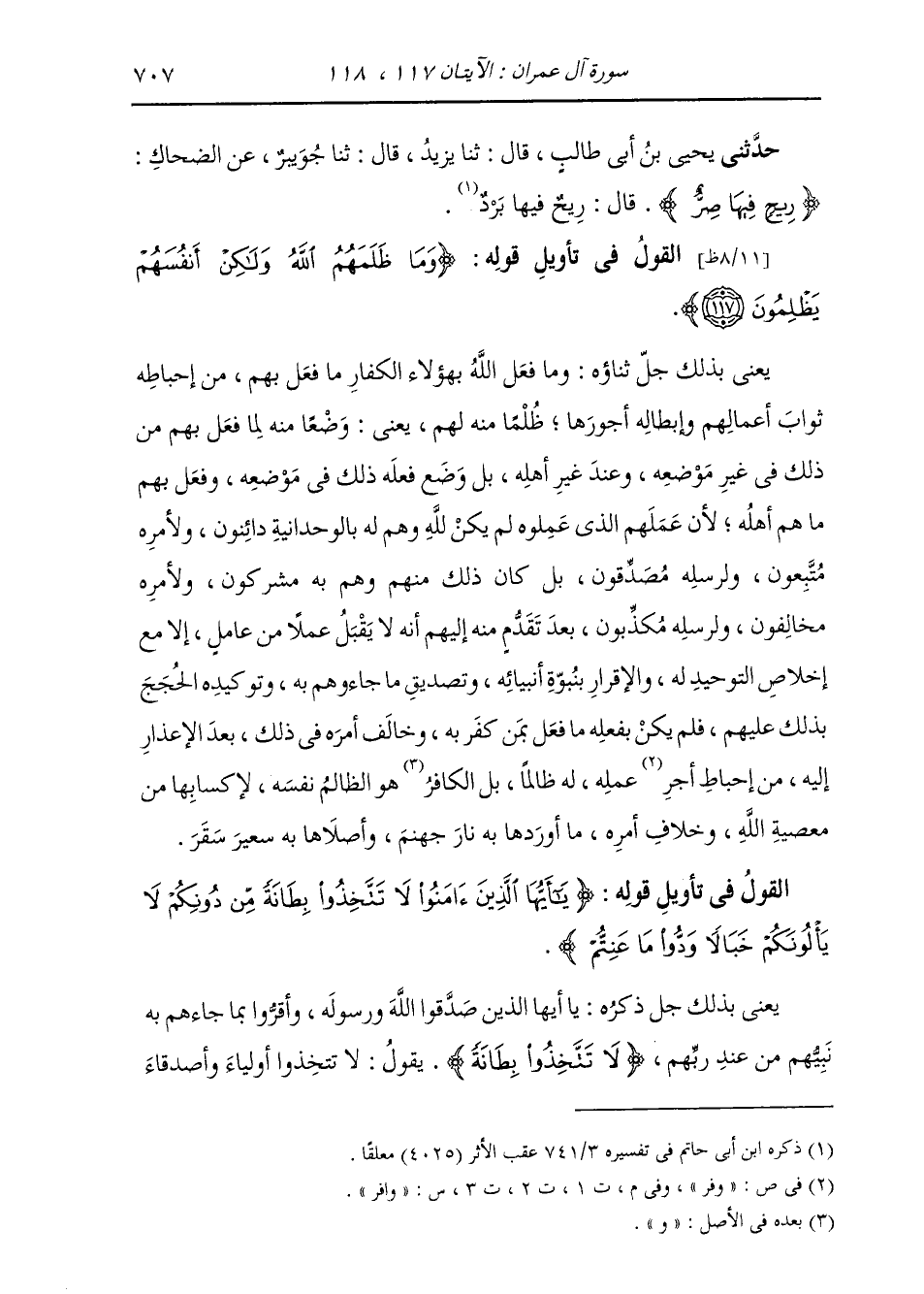 حَدَّثَنِي يَحْيَى بْنُ أَبِي طَالِبٍ، قَالَ: ثنا يَزِيدُ، قَالَ: ثنا جُوَيْبِرٌ، عَنِ الضَّحَّاكِ: {§رِيحٍ فِيهَا صِرٌّ} [آل عمران: 117] قَالَ: «رِيحٌ فِيهَا بَرْدٌ» يَعْنِي بِذَلِكَ جَلَّ ثناؤُهُ: وَمَا فَعَلَ اللَّهُ بِهَؤُلَاءِ الْكُفَّارِ مَا فَعَلَ بِهِمْ، مِنْ إِحْبَاطِهِ ثَوَابَ أَعْمَالِهِمْ، وَإِبْطَالِهِ أُجُورَهَا ظُلْمًا مِنْهُ لَهُمْ، يَعْنِي: وَضْعًا مِنْهُ لِمَا فَعَلَ بِهِمْ مِنْ ذَلِكَ فِي غَيْرِ مَوْضِعِهِ وَعِنْدَ غَيْرِ أَهْلِهِ، بَلْ وَضَعَ فَعْلَهُ ذَلِكَ فِي مَوْضِعِهِ، وَفَعَلَ بِهِمْ مَا هُمْ أَهْلُهُ؛ لِأَنَّ عَمَلَهُمُ الَّذِي عَمِلُوهُ لَمْ يَكُنْ لِلَّهِ، وَهُمْ لَهُ بِالْوَحْدَانِيَّةِ دَائِنُونَ وَلِأَمْرِهِ مُتَّبِعُونَ، وَلِرُسُلِهِ مُصَدَّقُونَ، بَلْ كَانَ ذَلِكَ مِنْهُمْ وَهُمْ بِهِ مُشْرِكُونَ، وَلِأَمْرِهِ مُخَالِفُونَ، وَلِرُسُلِهِ مُكَذِّبُونَ، بَعْدَ تَقَدُّمٍ مِنْهُ إِلَيْهِمْ أَنَّهُ لَا يَقْبَلُ عَمَلًا مِنْ عَامِلٍ إِلَّا مَعَ إِخْلَاصِ التَّوْحِيدِ لَهُ، وَالْإِقْرَارِ بِنُبُوَّةِ أَنْبِيَائِهِ، وَتَصْدِيقِ مَا جَاءُوهُمْ بِهِ، وَتَوْكِيدِهِ الْحُجَجَ بِذَلِكَ عَلَيْهِمْ، فَلَمْ يَكُنْ بِفِعْلِهِ مَا فَعَلَ بِمَنْ كَفَرَ بِهِ وَخَالَفَ أَمْرَهُ فِي ذَلِكَ بَعْدَ الْإِعْذَارِ إِلَيْهِ مِنْ إِحْبَاطِ وَافِرِ عَمَلِهِ لَهُ ظَالِمًا، بَلْ الْكَافِرُ هُوَ الظَّالِمُ نَفْسَهُ لِإِكْسَابِهَا مِنْ مَعْصِيَةِ اللَّهِ وَخِلَافِ أَمْرِهِ مَا أَوْرَدَهَا بِهِ نَارَ جَهَنَّمَ وَأَصْلَاهَا بِهِ سَعِيرَ سَقَرَ