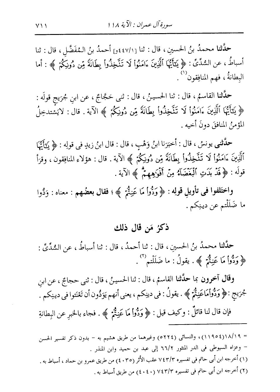 حَدَّثَنَا مُحَمَّدُ بْنُ الْحُسَيْنِ، قَالَ: ثنا أَحْمَدُ بْنُ الْمُفَضَّلِ، قَالَ: ثنا أَسْبَاطٌ، عَنِ السُّدِّيِّ: {يَا أَيُّهَا الَّذِينَ آمَنُوا §لَا تَتَّخِذُوا بِطَانَةً مِنْ دُونِكُمْ} [آل عمران: 118] " أَمَّا الْبِطَانَةُ: فَهُمُ الْمُنَافِقُونَ "