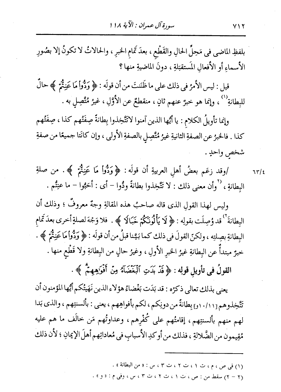 بِلَفْظِ الْمَاضِي فِي مَحَلِّ الْحَالِ وَالْقَطْعِ بَعْدَ تَمَامِ الْخَبَرِ، وَالْحَالَاتُ الَّتِي لَا تَكُونُ إِلَّا بِصُوَرِ الْأَسْمَاءِ وَالْأَفْعَالِ الْمُسْتَقْبَلَةِ دُونَ الْمَاضِيَةِ مِنْهَا؟ قِيلَ: لَيْسَ الْأَمْرُ فِي ذَلِكَ عَلَى مَا ظَنَنْتَ مِنْ أَنَّ قَوْلَهُ: {وَدُّوا مَا عَنِتُّمْ} [آل عمران: 118] حَالٌ مِنَ الْبِطَانَةِ، وَإِنَّمَا هُوَ خَبَرٌ عَنْهُمْ ثَانٍ، مُنْقَطِعٌ عَنِ الْأَوَّلِ غَيْرُ مُتَّصِلٍ بِهِ، وَإِنَّمَا تَأْوِيلُ الْكَلَامِ: يَا أَيُّهَا الَّذِينَ آمَنُوا لَا تَتَّخِذُوا بِطَانَةٌ صِفَتُهُمْ كَذَا صِفَتُهُمْ كَذَا، فَالْخَبَرُ عَنِ الصُّفَّةِ الثَّانِيَةِ غَيْرُ مُتَّصِلٍ بِالصِّفَةِ الْأُولَى، وَإِنْ كَانَتَا جَمِيعًا مِنْ صِفَةِ شَخْصٍ وَاحِدٍ. وَقَدْ زَعَمَ بَعْضُ أَهْلِ الْعَرَبِيَّةِ أَنَّ قَوْلَهُ: {وَدُّوا مَا عَنِتُّمْ} [آل عمران: 118] مِنْ صِلَةِ الْبِطَانَةِ، وَقَدْ وُصِلَتْ بِقَوْلِهِ: {لَا يَأْلُونَكُمْ خَبَالًا} [آل عمران: 118] فَلَا وَجْهَ لِصِلَةٍ أُخْرَى بَعْدَ تَمَامِ الْبِطَانَةِ بِصِلَتِهِ، وَلَكِنَّ الْقَوْلَ فِي ذَلِكَ كَمَا بَيَّنَّا قَبْلُ مِنْ أَنَّ قَوْلَهُ: {وَدُّوا مَا عَنِتُّمْ} [آل عمران: 118] خَبَرٌ مُبْتَدَأٌ عَنِ الْبِطَانَةِ غَيْرُ الْخَبَرِ الْأَوَّلِ، وَغَيْرُ حَالٍ مِنَ الْبِطَانَةِ وَلَا قَطْعٍ مِنْهَا