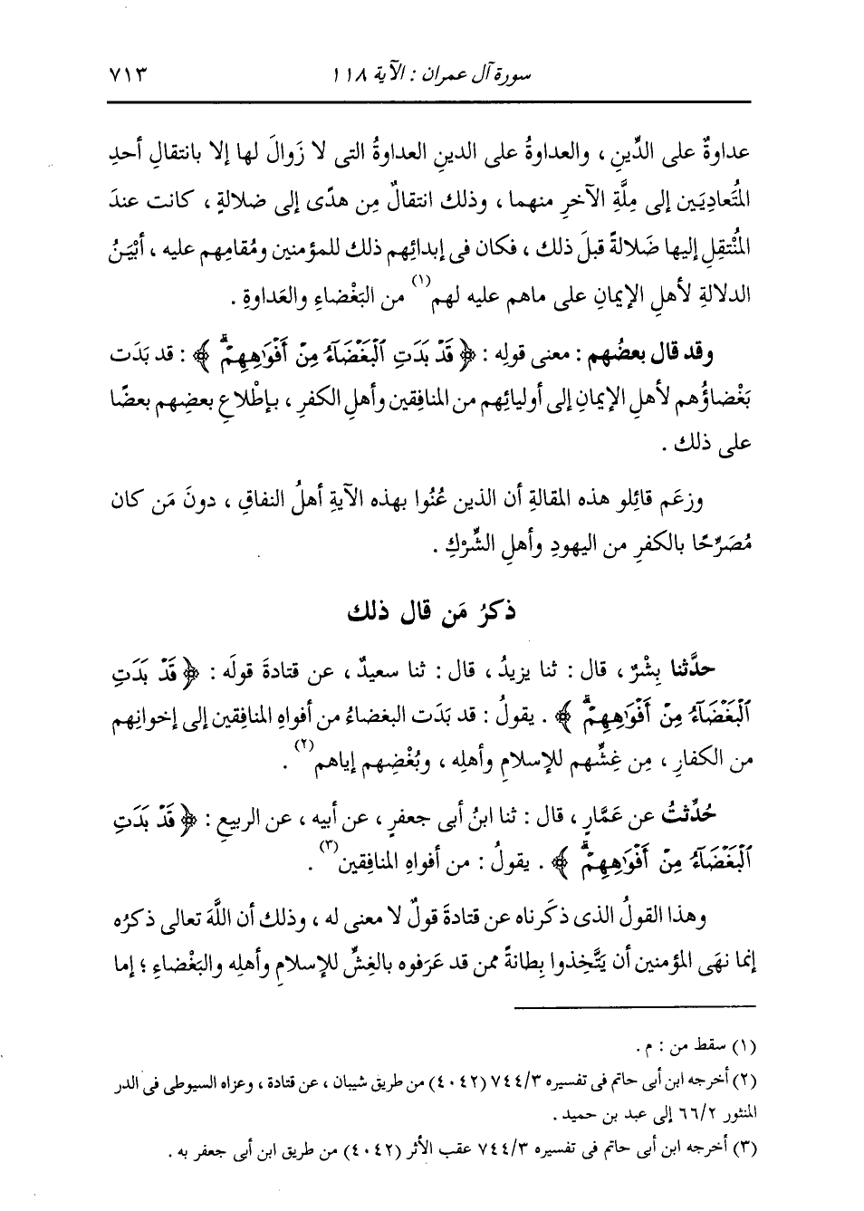 حُدِّثْتُ عَنْ عَمَّارٍ، قَالَ: ثنا ابْنُ أَبِي جَعْفَرٍ، عَنْ أَبِيهِ، عَنِ الرَّبِيعِ: {§قَدْ بَدَتِ الْبَغْضَاءُ مِنْ أَفْوَاهِهِمْ} [آل عمران: 118] يَقُولُ: «مِنْ أَفْوَاهِ الْمُنَافِقِينَ» وَهَذَا الْقَوْلُ الَّذِي ذَكَرْنَاهُ عَنْ قَتَادَةَ قَوْلٌ لَا مَعْنَى لَهُ، وَذَلِكَ أَنَّ اللَّهَ تَعَالَى ذِكْرُهُ إِنَّمَا نَهَى الْمُؤْمِنِينَ أَنْ يَتَّخِذُوا بِطَانَةً مِمَّنْ قَدْ عَرَفُوهُ بِالْغِشِّ لِلْإِسْلَامِ وَأَهْلِهِ، وَالْبَغْضَاءُ إِمَّا