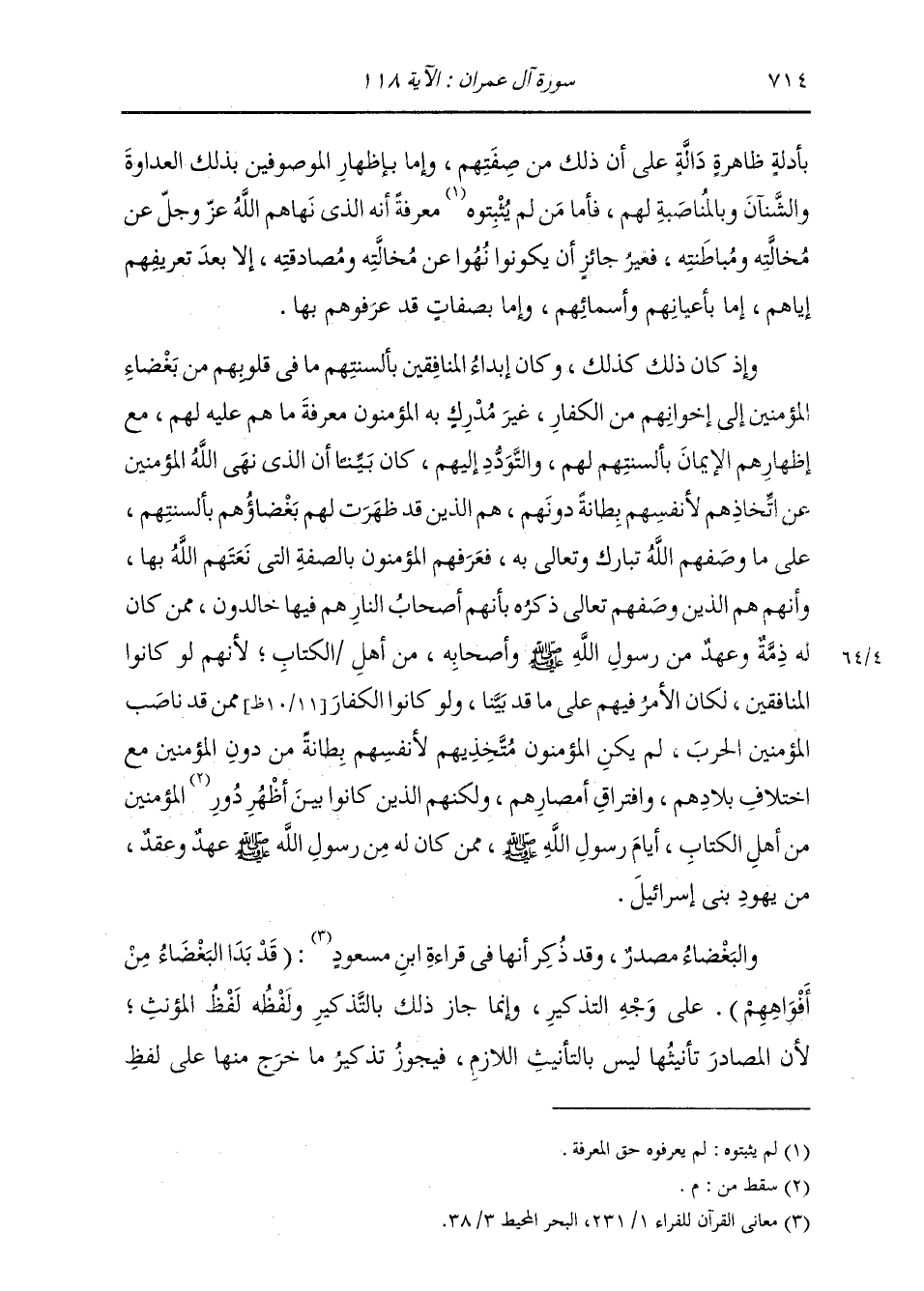 بِأَدِلَّةٍ ظَاهِرَةٍ دَالَّةٍ عَلَى أَنَّ ذَلِكَ مِنْ صِفَتِهِمْ، وَإِمَّا بِإِظْهَارِ الْمَوْصُوفِينَ بِذَلِكَ الْعَدَاوَةَ وَالشَّنَآنَ وَالْمُنَاصَبَةَ لَهُمْ، فَأَمَّا مَنْ لَمْ يُثْبِتُوهُ مَعْرِفَةً أَنَّهُ الَّذِي نَهَاهُمُ اللَّهُ عَزَّ وَجَلَّ عَنْ مُخَالَّتِهِ وَمُبَاطَنَتِهِ، فَغَيْرُ جَائِزٍ أَنْ يَكُونُوا نُهُوا عَنْ مُخَالَّتِهِ وَمُصَادَقَتِهِ إِلَّا بَعْدَ تَعْرِيفِهِمْ إِيَّاهُمْ، إِمَّا بِأَعْيَانِهِمْ وَأَسْمَائِهِمْ، وَإِمَّا بِصِفَاتٍ قَدْ عَرَفُوهُمْ بِهَا. وَإِذْ كَانَ ذَلِكَ كَذَلِكَ، وَكَانَ إِبْدَاءُ الْمُنَافِقِينَ بِأَلْسِنَتِهِمْ مَا فِي قُلُوبِهِمْ مِنْ بَغْضَاءِ الْمُؤْمِنِينَ إِلَى إِخْوَانِهِمْ مِنَ الْكُفَّارِ، غَيْرَ مُدْرِكٍ بِهِ الْمُؤْمِنُونَ مَعْرِفَةَ مَا هُمْ عَلَيْهِ لَهُمْ مَعَ إِظْهَارِهِمُ الْإِيمَانَ بِأَلْسِنَتِهِمْ لَهُمْ وَالتَّوَدُّدِ إِلَيْهِمْ، كَانَ بَيِّنَّا أَنَّ الَّذِيَ نَهَى اللَّهُ الْمُؤْمِنِينَ عَنِ اتِّخَاذِهِمْ لِأَنْفُسِهِمْ بِطَانَةً دُونَهُمْ، هُمُ الَّذِينَ قَدْ ظَهَرَتْ لَهُمْ بَغْضَاؤُهُمْ بِأَلْسِنَتِهِمْ عَلَى مَا وَصَفَهُمُ اللَّهُ عَزَّ وَجَلَّ بِهِ، فَعَرَفَهُمُ الْمُؤْمِنُونَ بِالصِّفَةِ الَّتِي نَعَتَهُمُ اللَّهُ بِهَا، وَأَنَّهُمْ هُمُ الَّذِينَ وَصَفَهُمْ تَعَالَى ذِكْرُهُ بِأَنَّهُمْ أَصْحَابُ النَّارِ هُمْ فِيهَا خَالِدُونَ مِمَّنْ كَانَ لَهُ ذِمَّةٌ وَعَهْدٌ مِنْ رَسُولِ اللَّهِ صَلَّى اللهُ عَلَيْهِ وَسَلَّمَ وَأَصْحَابِهِ مِنْ أَهْلِ الْكِتَابِ؛ لِأَنَّهُمْ لَوْ كَانُوا الْمُنَافِقِينَ لَكَانَ الْأَمْرُ فِيهِمْ عَلَى مَا قَدْ بَيَّنَّا، وَلَوْ كَانُوا الْكُفَّارَ مِمَّنْ قَدْ نَاصَبَ الْمُؤْمِنِينَ الْحَرْبَ، لَمْ يَكُنِ الْمُؤْمِنُونَ مُتَّخِذِيهِمْ لِأَنْفُسِهِمْ بِطَانَةً مِنْ دُونِ الْمُؤْمِنِينَ مَعَ اخْتِلَافِ بِلَادِهِمْ وَافْتِرَاقِ أَمْصَارِهِمْ، وَلَكِنَّهُمُ الَّذِينَ كَانُوا بَيْنَ أَظْهُرِ الْمُؤْمِنِينَ مِنْ أَهْلِ الْكِتَابِ أَيَّامَ رَسُولِ اللَّهِ صَلَّى اللهُ عَلَيْهِ وَسَلَّمَ، مِمَّنْ كَانَ لَهُ مِنْ رَسُولِ اللَّهِ صَلَّى اللهُ عَلَيْهِ وَسَلَّمَ عَهْدٌ وَعَقْدٌ مِنْ يَهُودِ بَنِي إِسْرَائِيلَ، وَالْبَغْضَاءُ: مَصْدَرٌ، وَقَدْ ذُكِرَ أَنَّهَا فِي قِرَاءَةِ عَبْدِ اللَّهِ بْنِ مَسْعُودِ: «قَدْ بَدَا الْبَغْضَاءُ مِنْ أَفْوَاهِهِمْ» ، عَلَى وَجْهِ التَّذْكِيرِ، وَإِنَّمَا جَازَ ذَلِكَ بِالتَّذْكِيرِ وَلَفْظُهُ لَفْظُ الْمُؤَنَّثِ؛ لِأَنَّ الْمَصَادِرَ تَأْنِيثُهَا لَيْسَ بِالتَّأْنِيثِ اللَّازِمِ، فَيَجُوزُ تَذْكِيرُ مَا خَرَجَ مِنْهَا عَلَى لَفْظِ