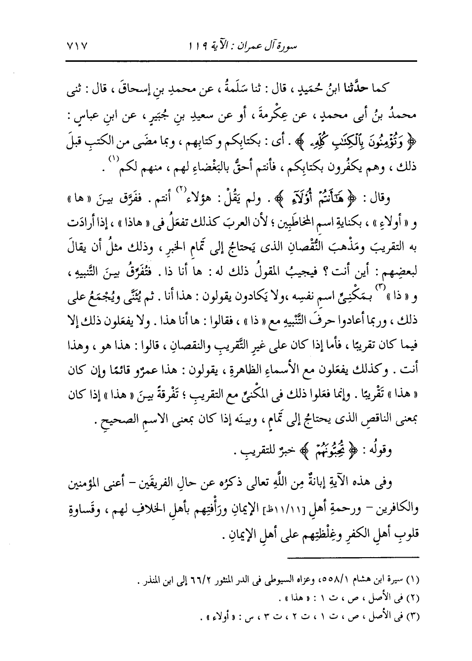 كَمَا: حَدَّثَنَا ابْنُ حُمَيْدٍ، قَالَ: ثنا سَلَمَةُ، عَنِ ابْنِ إِسْحَاقَ، قَالَ: ثني مُحَمَّدُ بْنُ أَبِي مُحَمَّدٍ، عَنْ عِكْرِمَةَ أَوْ عَنْ سَعِيدِ بْنِ جُبَيْرٍ، عَنِ ابْنِ عَبَّاسٍ: {§وَتُؤْمِنُونَ بِالْكِتَابِ كُلِّهِ} [آل عمران: 119] «أَيْ بِكِتَابِكُمْ وَكِتَابِهِمْ، وَبِمَا مَضَى مِنَ الْكُتُبِ قَبْلَ ذَلِكَ، وَهُمْ يَكْفُرُونَ بِكِتَابِكُمْ، فَأَنْتُمْ أَحَقُّ بِالْبَغْضَاءِ لَهُمْ مِنْهُمْ لَكُمْ» وَقَالَ: {هَا أَنْتُمْ أُولَاءِ} وَلَمْ يَقُلْ: «هَؤُلَاءِ أَنْتُمْ» ، فَفَرَّقَ بَيْنَ «هَا، وَأُولَاءِ» بِكِنَايَةِ اسْمِ الْمُخَاطَبِينَ؛ لِأَنَّ الْعَرَبَ كَذَلِكَ تَفْعَلُ فِي هَذَا إِذَا أَرَادَتْ بِهِ التَّقْرِيبَ وَمَذْهَبُ النُّقْصَانِ لِلَّذِي يَحْتَاجُ إِلَى تَمَامِ الْخَبَرِ، وَذَلِكَ مِثْلُ أَنْ يُقَالَ لِبَعْضِهِمْ: أَيْنَ أَنْتَ؟ فَيُجِيبُ الْمَقُولُ ذَلِكَ لَهُ: هَا أَنَا ذَا، فَيُفَرِّقُ بَيْنَ التَّنْبِيهِ وَ «ذَا» بِمَكْنِيِّ اسْمِ نَفْسِهِ، وَلَا يَكَادُونَ يَقُولُونَ: هَذَا أَنَا، ثُمَّ يُثَنَّى وَيُجْمَعُ عَلَى ذَلِكَ، وَرُبَّمَا أَعَادُوا حَرْفَ التَّنْبِيهِ مَعَ ذَا، فَقَالُوا: هَا أَنَا هَذَا وَلَا يَفْعَلُونَ ذَلِكَ إِلَّا فِيمَا كَانَ تَقْرِيبًا، فَأَمَّا إِذَا كَانَ عَلَى غَيْرِ التَّقْرِيبِ وَالنُّقْصَانِ، قَالُوا: هَذَا هُوَ، وَهَذَا أَنْتَ، وَكَذَلِكَ يَفْعَلُونَ مَعَ الْأَسْمَاءِ الظَّاهِرَةِ، يَقُولُونَ: هَذَا عَمْرٌو قَائِمًا، إِنْ كَانَ هَذَا تَقْرِيبًا، وَإِنَّمَا فَعَلُوا ذَلِكَ فِي الْمَكْنِيِّ مَعَ التَّقْرِيبِ تَفْرِقَةً بَيْنَ هَذَا إِذَا كَانَ بِمَعْنَى النَّاقِصِ الَّذِي يَحْتَاجُ إِلَى تَمَامٍ، وَبَيْنَهُ وَبَيْنَ مَا إِذَا كَانَ بِمَعْنَى الِاسْمِ الصَّحِيحِ. وَقَوْلُهُ: {تُحِبُّونَهُمْ} [آل عمران: 119] خَبَرٌ لِلتَّقْرِيبِ. وَفِي هَذِهِ الْآيَةِ إِبَانَةٌ مِنَ اللَّهِ عَزَّ وَجَلَّ عَنْ حَالِ الْفَرِيقَيْنِ، أَعْنِي الْمُؤْمِنِينَ وَالْكَافِرِينَ، وَرَحْمَةِ أَهْلِ الْإِيمَانِ وَرَأْفَتِهِمْ بِأَهْلِ الْخِلَافِ لَهُمْ، وَقَسَاوَةِ قُلُوبِ أَهْلِ الْكُفْرِ وَغِلْظَتِهِمْ عَلَى أَهْلِ الْإِيمَانِ