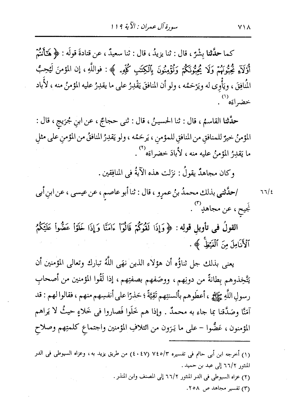 كَمَا: حَدَّثَنَا بِشْرٌ، قَالَ: ثنا يَزِيدُ، قَالَ: ثنا سَعِيدٌ، عَنْ قَتَادَةَ، قَوْلُهُ: {§هَا أَنْتُمْ أُولَاءِ تُحِبُّونَهُمْ وَلَا يُحِبُّونَكُمْ وَتُؤْمِنُونَ بِالْكِتَابِ كُلِّهِ} «فَوَاللَّهِ إِنَّ الْمُؤْمِنَ لَيُحِبُّ الْمُنَافِقَ وَيَأْوِي لَهُ وَيَرْحَمُهُ، وَلَوْ أَنَّ الْمُنَافِقَ يَقْدِرُ عَلَى مَا يَقْدِرُ عَلَيْهِ الْمُؤْمِنُ مِنْهُ لَأَبَادَ خَضْرَاءَهُ»