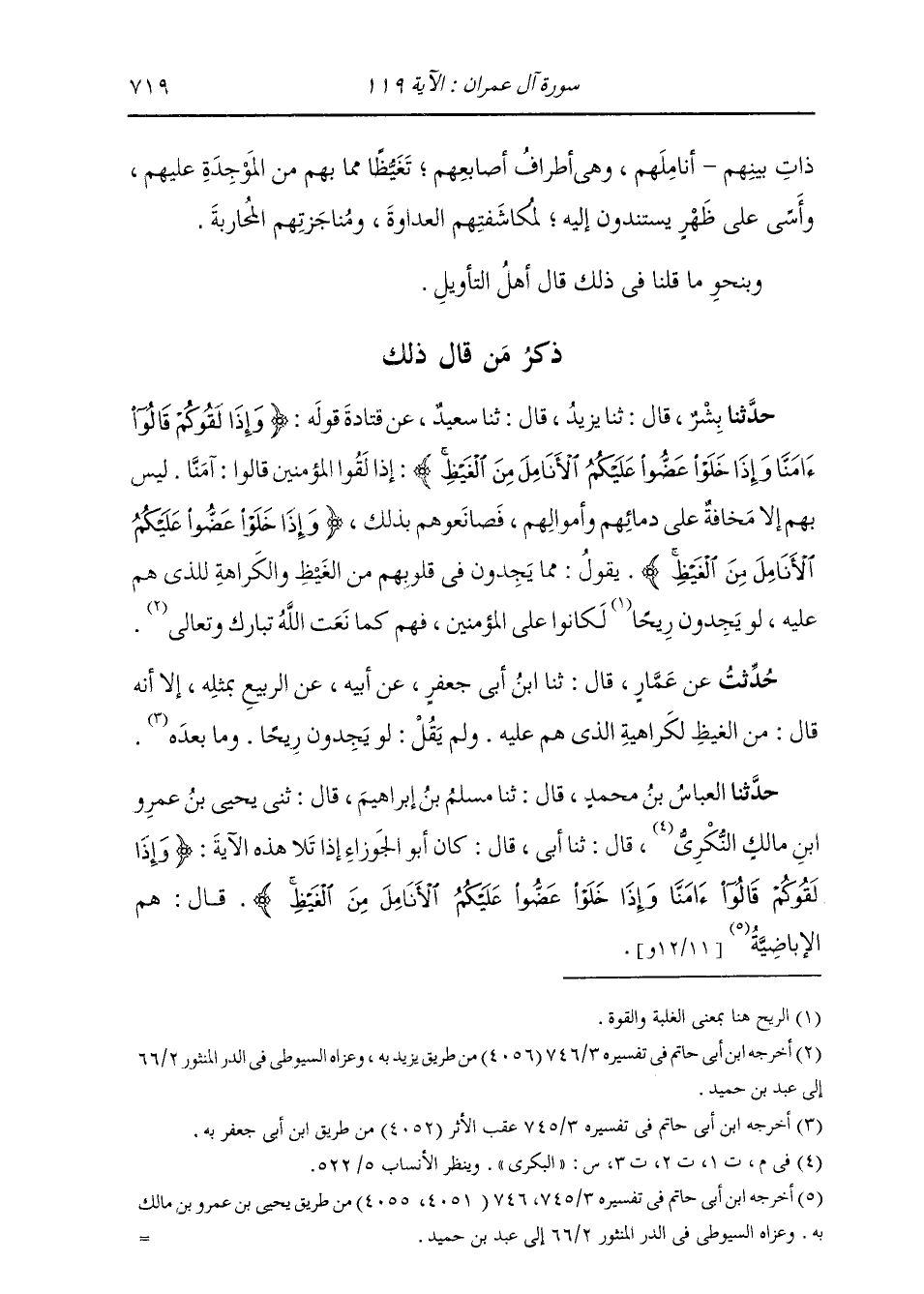 ذِكْرُ مَنْ قَالَ ذَلِكَ: حَدَّثَنَا بِشْرٌ، قَالَ: ثنا يَزِيدُ، قَالَ: ثنا سَعِيدٌ، عَنْ قَتَادَةَ، قَوْلُهُ: {§وَإِذَا لَقُوكُمْ قَالُوا آمَنَّا وَإِذَا خَلَوْا عَضُّوا عَلَيْكُمُ الْأَنَامِلَ مِنَ الْغَيْظِ} [آل عمران: 119] «إِذَا لَقُوا الْمُؤْمِنِينَ قَالُوا آمَنَّا لَيْسَ بِهِمْ إِلَّا مَخَافَةً عَلَى دِمَائِهِمْ وَأَمْوَالِهِمْ، فَصَانَعُوهُمْ بِذَلِكَ» {وَإِذَا خَلَوْا عَضُّوا عَلَيْكُمُ الْأَنَامِلَ مِنَ الْغَيْظِ} [آل عمران: 119] يَقُولُ: «مِمَّا يَجِدُونَ فِي قُلُوبِهِمْ مِنَ الْغَيْظِ وَالْكَرَاهَةِ لِمَا هُمْ عَلَيْهِ لَوْ يَجِدُونَ رِيحًا لَكَانُوا عَلَى الْمُؤْمِنِينَ، فَهُمْ كَمَا نَعَتَ اللَّهُ عَزَّ وَجَلَّ» حُدِّثْتُ عَنْ عَمَّارٍ، قَالَ: ثنا ابْنُ أَبِي جَعْفَرٍ، عَنْ أَبِيهِ، عَنِ الرَّبِيعِ، بِمِثْلِهِ، إِلَّا أَنَّهُ قَالَ: «مِنَ الْغَيْظِ لِكَرَاهَتِهِمُ الَّذِي هُمْ عَلَيْهِ» وَلَمْ يَقُلْ: " لَوْ يَجِدُونَ رِيحًا وَمَا بَعْدَهُ
