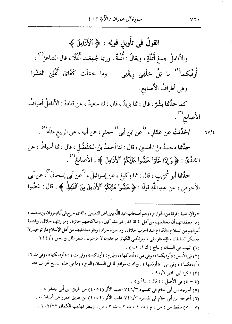 حَدَّثَنَا أَبُو كُرَيْبٍ، قَالَ: ثنا وَكِيعٌ، عَنْ إِسْرَائِيلَ، عَنْ أَبِي الْأَحْوَصِ، عَنْ عَبْدِ اللَّهِ، قَوْلُهُ: {§عَضُّوا عَلَيْكُمُ الْأَنَامِلَ مِنَ الْغَيْظِ} [آل عمران: 119] قَالَ: «عَضُّوا -[721]- عَلَى أَصَابِعِهِمْ»
