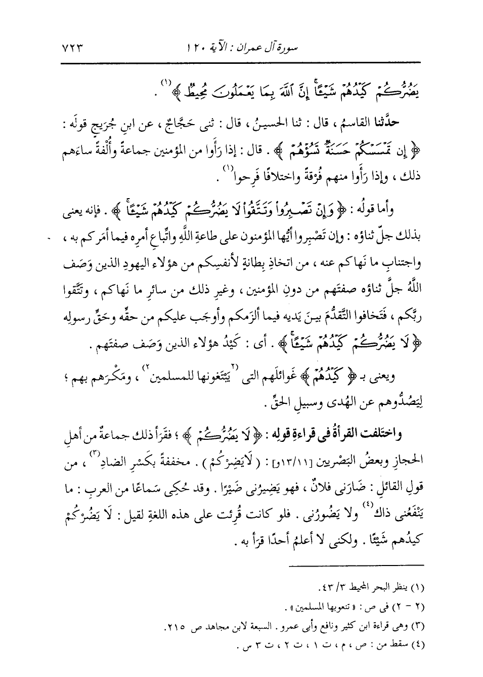 حَدَّثَنَا الْقَاسِمُ، قَالَ: ثنا الْحُسَيْنُ، قَالَ: ثني حَجَّاجٌ، عَنِ ابْنِ جُرَيْجٍ، قَوْلُهُ: {§إِنْ تَمْسَسْكُمْ حَسَنَةٌ تَسُؤْهُمْ} [آل عمران: 120] قَالَ: إِذَا رَأَوْا مِنَ الْمُؤْمِنِينَ جَمَاعَةً وَأُلْفَةً سَاءَهُمْ ذَلِكَ، وَإِذَا رَأَوْا مِنْهُمْ فُرْقَةً وَاخْتِلَافًا فَرِحُوا " وَأَمَّا قَوْلُهُ: {وَإِنْ تَصْبِرُوا وَتَتَّقُوا لَا يَضُرُّكُمْ كَيْدُهُمْ شَيْئًا} [آل عمران: 120] فَإِنَّهُ يَعْنِي بِذَلِكَ جَلَّ ثناؤُهُ: وَإِنْ تَصْبِرُوا أَيُّهَا الْمُؤْمِنُونَ عَلَى طَاعَةِ اللَّهِ، وَاتِّبَاعِ أَمْرِهِ فِيمَا أَمَرَكُمْ بِهِ، وَاجْتِنَابِ مَا نَهَاكُمْ عَنْهُ، مِنَ اتِّخَاذِ بِطَانَةٍ لِأَنْفُسِكُمْ مِنْ هَؤُلَاءِ الْيَهُودِ الَّذِينَ وَصَفَ اللَّهُ صِفَتَهُمْ مِنْ دُونِ الْمُؤْمِنِينَ، وَغَيْرِ ذَلِكَ مِنْ سَائِرِ مَا نَهَاكُمْ، وَتَتَّقُوا رَبَّكُمْ، فَتَخَافُوا التَّقَدُّمَ بَيْنَ يَدَيْهِ فِيمَا أَلْزَمَكُمْ، وَأَوْجَبَ عَلَيْكُمْ مِنْ حَقِّهِ وَحَقِّ رَسُولِهِ، لَا يَضُرُّكُمْ كَيْدُهُمْ شَيْئًا: أَيْ كَيَدُ هَؤُلَاءِ الَّذِينَ وَصَفَ صِفَتَهُمْ. وَيَعْنِي بِكَيْدِهِمْ غَوَائِلَهُمُ الَّتِي يَبْتَغُونَهَا لِلْمُسْلِمِينَ وَمَكْرَهُمْ بِهِمْ لِيَصُدُّوهُمْ عَنِ الْهُدَى وَسَبِيلِ الْحَقِّ. وَاخْتَلَفَ الْقُرَّاءُ فِي قِرَاءَةِ قَوْلِهِ: {لَا يَضُرُّكُمْ} [آل عمران: 120] فَقَرَأَ ذَلِكَ جَمَاعَةٌ مِنْ أَهْلِ الْحِجَازِ وَبَعْضُ الْبَصْرِيِّينَ: (لَا يَضِرْكُمْ) مُخَفَّفَةً بِكَسْرِ الضَّادِ مِنْ قَوْلِ الْقَائِلِ: ضَارَنِي فُلَانٌ فَهُوَ يُضِيرُنِي ضَيْرًا، وَقَدْ حُكِيَ سَمَاعًا مِنَ الْعَرَبِ: مَا يَنْفَعُنِي وَلَا يَضُورُنِي، فَلَوْ كَانَتْ قُرِئَتْ عَلَى هَذِهِ اللُّغَةِ لَقِيلَ: لَا يَضِرْكُمْ كَيْدُهُمْ شَيْئًا، وَلَكِنِّي لَا أَعْلَمُ أَحَدًا قَرَأَ بِهِ،