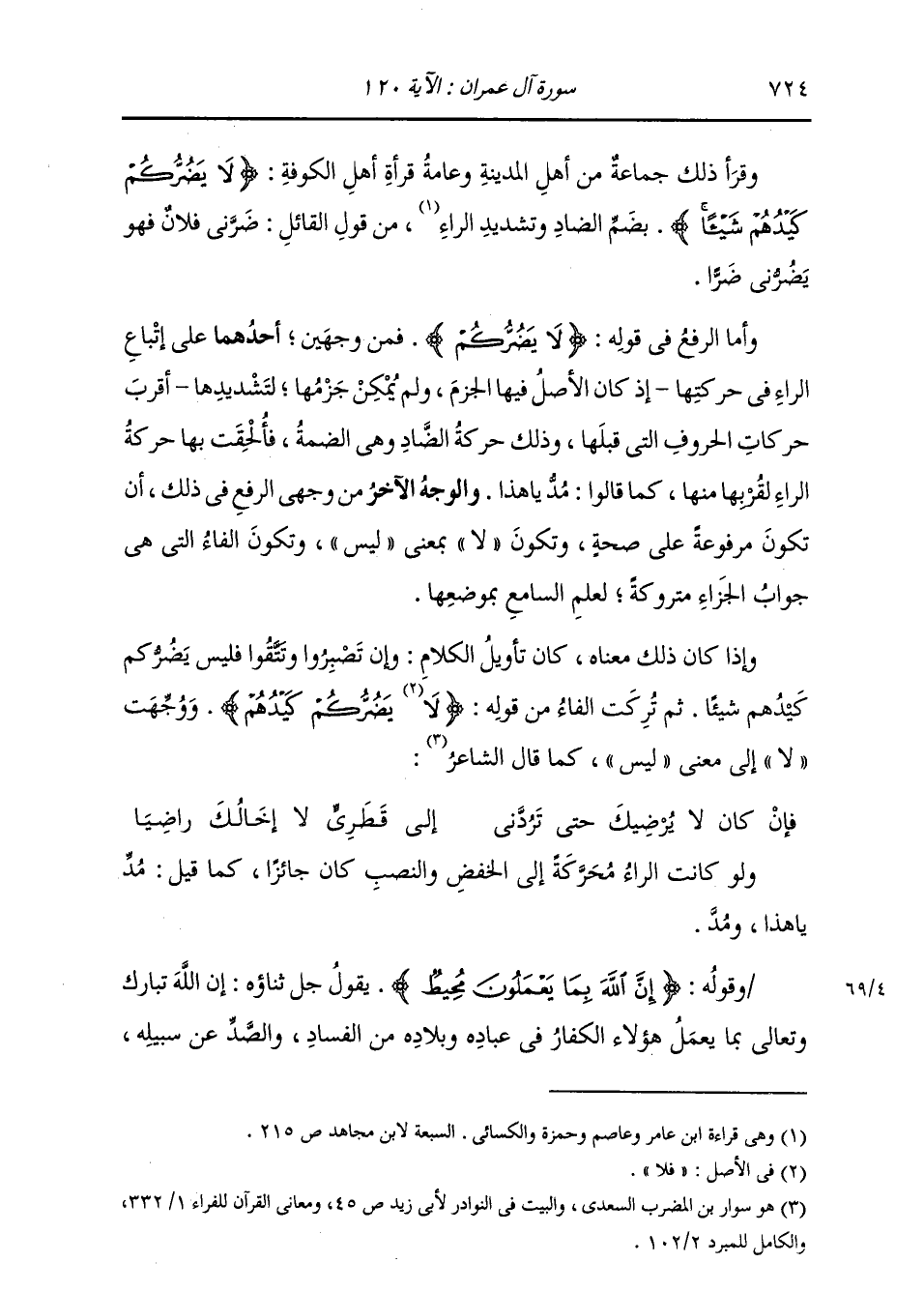 وَقَرَأَ ذَلِكَ جَمَاعَةٌ مِنْ أَهْلِ الْمَدِينَةِ وَعَامَّةُ قُرَّاءِ أَهْلِ الْكُوفَةِ: {لَا يَضُرُّكُمْ كَيْدُهُمْ شَيْئًا} [آل عمران: 120] بِضَمِّ الضَّادِ وَتَشْدِيدِ الرَّاءِ مِنْ قَوْلِ الْقَائِلِ: ضَرَّنِي فُلَانٌ فَهُوَ يَضُرُّنِي ضَرًّا. وَأَمَّا الرَّفْعُ فِي قَوْلِهِ: {لَا يَضُرُّكُمْ} [آل عمران: 120] فَمِنْ وَجْهَيْنِ: أَحَدُهُمَا عَلَى اتِّبَاعُ الرَّاءِ فِي حَرَكَتِهَا، إِذْ كَانَ الْأَصْلُ فِيهَا الْجَزْمُ، وَلَمْ يُمْكِنْ جَزْمُهَا لِتَشْدِيدِهَا أَقْرَبَ حَرَكَاتِ الْحُرُوفِ الَّتِي قَبْلَهَا، وَذَلِكَ حَرَكَةُ الضَّادِ، وَهِيَ الضَّمَّةُ، فَأُلْحِقَتْ بِهَا حَرَكَةُ الرَّاءِ لِقُرْبِهَا مِنْهَا، كَمَا قَالُوا: مُدَّ يَا هَذَا، وَالْوَجْهُ الْآخَرُ مِنْ وَجْهَيِ الرَّفْعِ فِي ذَلِكَ: أَنْ تَكُونَ مَرْفُوعَةً عَلَى صِحَّةٍ، وَتَكُونُ «لَا» بِمَعْنَى «لَيْسَ» ، وَتَكُونُ الْفَاءُ الَّتِي هِيَ جَوَّابُ الْجَزَاءِ مَتْرُوكَةً لَعِلْمِ السَّامِعِ بِمَوْضِعِهَا، وَإِذَا كَانَ ذَلِكَ مَعْنَاهُ، كَانَ تَأْوِيلُ الْكَلَامِ: وَإِنْ تَصْبِرُوا وَتَتَّقُوا فَلَيْسَ يَضُرُّكُمْ كَيْدُهُمْ شَيْئًا، ثُمَّ تُرِكَتِ الْفَاءُ مِنْ قَوْلِهِ: {لَا يَضُرُّكُمْ كَيْدُهُمْ} [آل عمران: 120] وَوُجِّهَتْ «لَا» إِلَى مَعْنَى «لَيْسَ» ، كَمَا قَالَ الشَّاعِرُ: