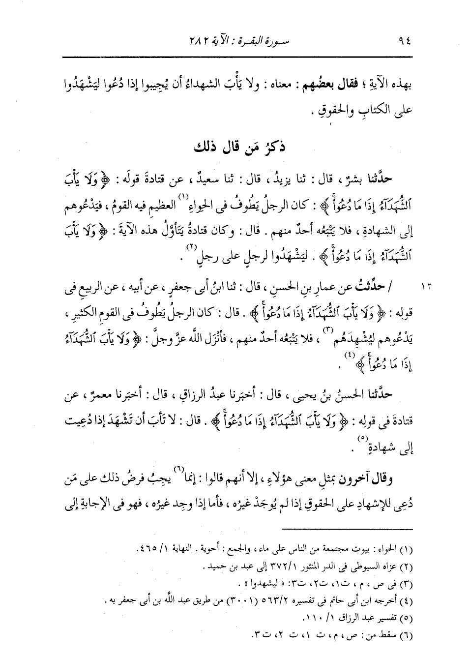 ذِكْرُ مَنْ قَالَ ذَلِكَ: حَدَّثَنَا بِشْرٌ، قَالَ: ثنا يَزِيدُ، قَالَ: ثنا سَعِيدٌ، عَنْ قَتَادَةَ، قَوْلُهُ تَعَالَى: " {§وَلَا يَأْبَ الشُّهَدَاءُ إِذَا مَا دُعُوا} [البقرة: 282] كَانَ الرَّجُلُ يَطُوفُ فِي الْحِوَاءِ الْعَظِيمِ فِيهِ الْقَوْمُ، فَيَدْعُوهُمْ إِلَى الشَّهَادَةِ فَلَا يَتْبَعُهُ أَحَدٌ مِنْهُمْ " قَالَ: وَكَانَ قَتَادَةُ يَتَأَوَّلُ هَذِهِ الْآيَةَ: {وَلَا يَأْبَ الشُّهَدَاءُ إِذَا مَا دُعُوا} [البقرة: 282] لِيَشْهَدُوا لِرَجُلٍ عَلَى رَجُلٍ