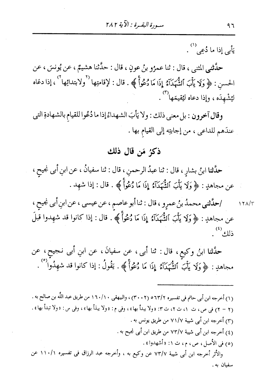 حَدَّثَنِي الْمُثَنَّى، قَالَ: ثنا عَمْرُو بْنُ عَوْنٍ، قَالَ: أَخْبَرَنَا هُشَيْمٌ، عَنْ يُونُسَ، عَنِ الْحَسَنِ: {§وَلَا يَأْبَ الشُّهَدَاءُ إِذَا مَا دُعُوا} [البقرة: 282] قَالَ: «لِإِقَامَتِهَا، وَلَا يَبْذَأْ بِهَا إِذَا دَعَاهُ لِيُشْهِدَهُ، وَإِذَا دَعَاهُ لِيُقِيمَهَا» وَقَالَ آخَرُونَ: بَلْ مَعْنَى ذَلِكَ: وَلَا يَأْبَ الشُّهَدَاءُ إِذَا مَا دُعُوا لِلْقِيَامِ بِالشَّهَادَةِ الَّتِي عِنْدَهُمْ لِلدَّاعِي مِنْ إِجَابَتِهِ إِلَى الْقِيَامِ بِهَا