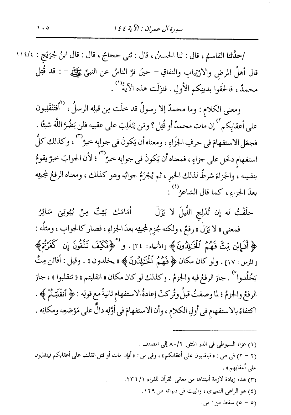 حَدَّثَنَا الْقَاسِمُ، قَالَ: ثنا الْحُسَيْنُ، قَالَ: ثني حَجَّاجٌ، قَالَ: قَالَ ابْنُ جُرَيْجٍ: قَالَ: " أَهْلُ الْمَرَضِ وَالِارْتِيَابِ وَالنِّفَاقِ §حِينَ فَرَّ النَّاسُ عَنِ النَّبِيِّ صَلَّى اللهُ عَلَيْهِ وَسَلَّمَ: قَدْ قُتِلَ مُحَمَّدٌ، فَالْحَقُوا بِدِينِكُمُ الْأَوَّلِ فَنَزَلَتْ هَذِهِ الْآيَةُ " وَمَعْنَى الْكَلَامِ: وَمَا مُحَمَّدٌ إِلَّا رَسُولٌ قَدْ خَلَتْ مِنْ قَبْلِهِ الرُّسُلُ، أَفَتَنْقَلِبُونَ عَلَى أَعْقَابِكُمْ إِنْ مَاتَ مُحَمَّدٌ أَوْ قُتِلَ؟ وَمَنْ يَنْقَلِبْ عَلَى عَقِبَيْهِ فَلَنْ يَضُرَّ اللَّهَ شَيْئًا فَجَعَلَ الِاسْتِفْهَامَ فِي حَرْفِ الْجَزَاءِ، وَمَعْنَاهُ أَنْ يَكُونَ فِي جَوَابِهِ خَبَرٌ وَكَذَلِكَ كُلُّ اسْتِفْهَامٍ دَخَلَ عَلَى جَزَاءٍ، فَمَعْنَاهُ أَنْ يَكُونَ فِي جَوَابِهِ خَبَرٌ لِأَنَّ الْجَوَابَ خَبَرٌ يَقُومُ بِنَفْسِهِ وَالْجَزَاءَ شَرْطٌ لِذَلِكَ الْخَبَرِ ثُمَّ يُجْزَمُ جَوَابُهُ وَهُوَ كَذَلِكَ، وَمَعْنَاهُ الرَّفْعُ لِمَجِيئِهِ بَعْدَ الْجَزَاءِ، كَمَا قَالَ الشَّاعِرُ: