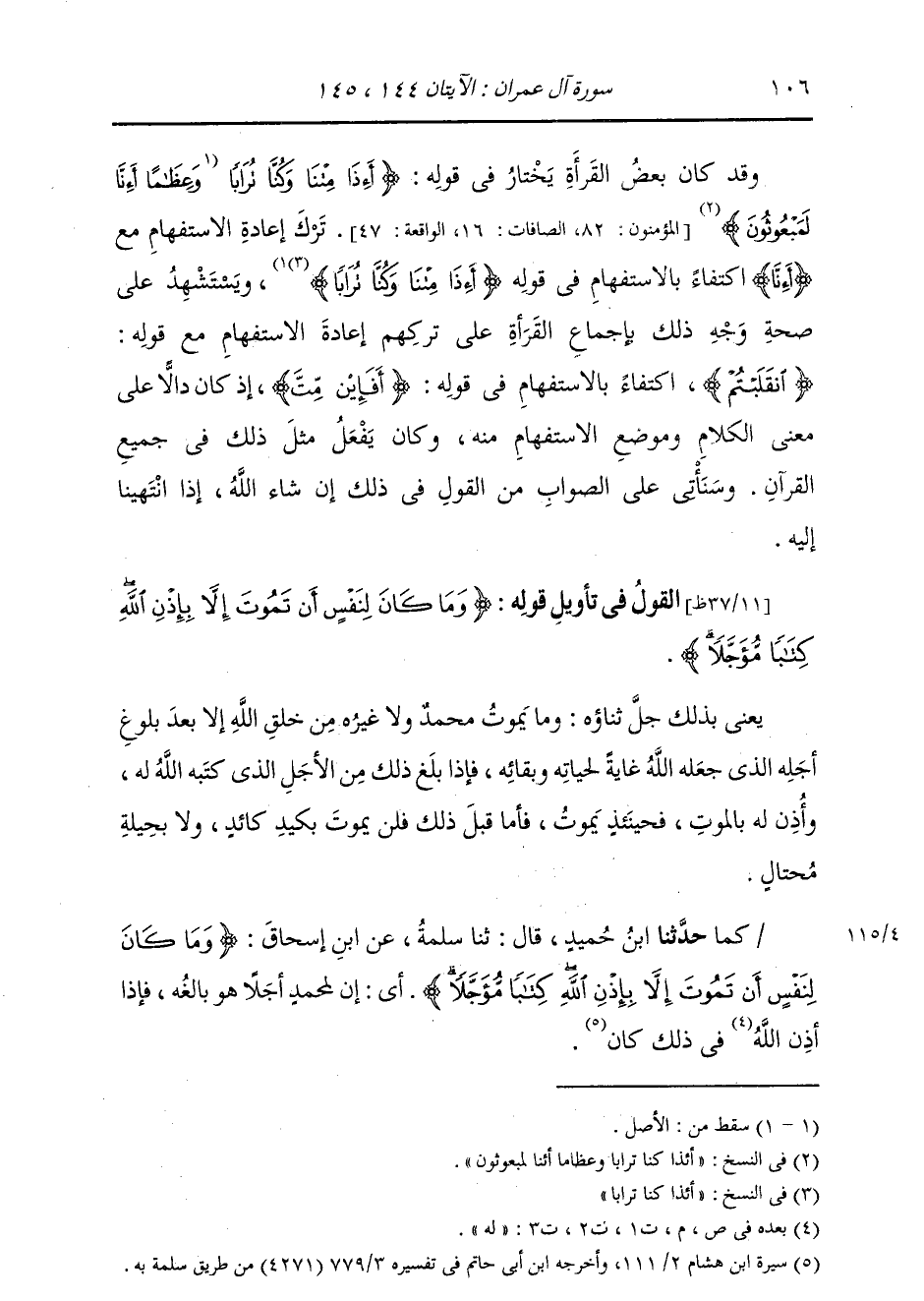 كَمَا: حَدَّثَنَا ابْنُ حُمَيْدٍ، قَالَ: ثنا سَلَمَةُ، عَنِ ابْنِ إِسْحَاقَ: {§وَمَا كَانَ لِنَفْسٍ أَنْ تَمُوتَ إِلَّا بِإِذْنِ اللَّهِ كِتَابًا مُؤَجَّلًا} [آل عمران: 145] «أَيْ أَنَّ لِمُحَمَّدٍ أَجَلًا هُوَ بَالِغُهُ إِذَا أَذِنَ اللَّهُ لَهُ فِي ذَلِكَ كَانَ» -[107]- وَقَدْ قِيلَ: إِنَّ مَعْنَى ذَلِكَ: وَمَا كَانَتْ نَفْسٌ لِتَمُوتَ إِلَّا بِإِذْنِ اللَّهِ. وَقَدِ اخْتَلَفَ أَهْلُ الْعَرَبِيَّةِ فِي مَعْنَى النَّاصِبِ قَوْلَهُ: {كِتَابًا مُؤَجَّلًا} [آل عمران: 145] ؛ فَقَالَ بَعْضُ نَحْوِيِّي الْبَصْرَةِ: هُوَ تَوْكِيدٌ، وَنَصْبُهُ عَلَى: كَتَبَ اللَّهُ كِتَابًا مُؤَجَّلًا، قَالَ: وَكَذَلِكَ كُلُّ شَيْءٍ فِي الْقُرْآنِ مِنْ قَوْلِهِ «حَقًّا» ، إِنَّمَا هُوَ: أَحَقَّ ذَلِكَ حَقًّا، وَكَذَلِكَ: {وَعْدَ اللَّهِ} [النساء: 122] ، وَ {رَحْمَةً مِنْ رَبِّكَ} [الإسراء: 28] ، وَ {صُنْعَ اللَّهِ الَّذِي أَتْقَنَ كُلَّ شَيْءٍ} [النمل: 88] ، وَ {كِتَابَ اللَّهِ عَلَيْكُمْ} [النساء: 24] إِنَّمَا هُوَ: صَنَعَ اللَّهُ هَكَذَا صُنْعًا، فَهَكَذَا تَفْسِيرُ كُلِّ شَيْءٍ فِي الْقُرْآنِ مِنْ نَحْوِ هَذَا، فَإِنَّهُ كَثِيرٌ. وَقَالَ بَعْضُ نَحْوِيِّي الْكُوفَةِ فِي قَوْلِهِ: {وَمَا كَانَ لِنَفْسٍ أَنْ تَمُوتَ إِلَّا بِإِذْنِ اللَّهِ} [آل عمران: 145] مَعْنَاهُ: كَتَبَ اللَّهُ آجَالَ النُّفُوسِ، ثُمَّ قِيلَ: كِتَابًا مُؤَجَّلًا، فَأَخْرَجَ قَوْلَهُ: كِتَابًا مُؤَجَّلًا، نَصَبًا مِنَ الْمَعْنَى الَّذِي فِي الْكَلَامِ، إِذْ كَانَ قَوْلُهُ: {وَمَا كَانَ لِنَفْسٍ أَنْ تَمُوتَ إِلَّا بِإِذْنِ اللَّهِ} [آل عمران: 145] قَدْ أَدَّى عَنْ مَعْنَى «كَتَبَ» ، قَالَ: وَكَذَلِكَ سَائِرُ مَا فِي الْقُرْآنِ مِنْ نَظَائِرِ ذَلِكَ، فَهُوَ عَلَى هَذَا النَّحْوِ. وَقَالَ آخَرُونَ مِنْهُمْ: قَوْلُ الْقَائِلِ: زَيْدٌ قَائِمٌ حَقًّا، بِمَعْنَى: أَقُولُ زَيْدٌ قَائِمٌ حَقًّا؛ لِأَنَّ كُلَّ كَلَامٍ قَوْلٌ، فَأَدَّى الْمَقُولُ عَنِ الْقَوْلِ، ثُمَّ خَرَجَ مَا بَعْدَهُ مِنْهُ، كَمَا تَقُولُ: أَقُولُ قَوْلًا حَقًّا، وَكَذَلِكَ ظَنًّا وَيَقِينًا، وَكَذَلِكَ وَعَدَ اللَّهِ، وَمَا أَشْبَهَهُ. -[108]- وَالصَّوَابُ مِنَ الْقَوْلِ فِي ذَلِكَ عِنْدِي، أَنَّ كُلَّ ذَلِكَ مَنْصُوبٌ عَلَى الْمَصْدَرِ مِنْ مَعْنَى الْكَلَامِ الَّذِي قَبْلَهُ، لِأَنَّ فِي كُلِّ مَا قَبْلَ الْمَصَادِرِ الَّتِي هِيَ مُخَالِفَةٌ أَلْفَاظُهَا أَلْفَاظَ مَا قَبْلَهَا مِنَ الْكَلَامِ مَعَانِي أَلْفَاظِ الْمَصَادِرِ وَإِنْ خَالَفَهَا فِي اللَّفْظِ فَنَصْبُهَا مِنْ مَعَانِي مَا قَبْلَهَا دُونَ أَلْفَاظِهِ
