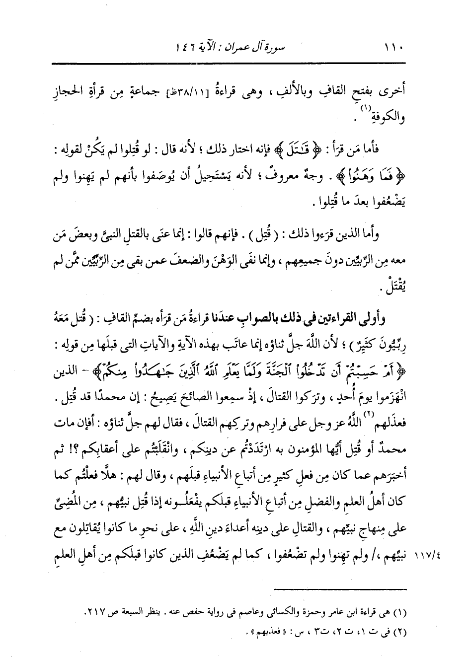 أُخْرَى بِفَتْحِ الْقَافِ وَبِالْأَلِفِ، وَهِيَ قِرَاءَةُ جَمَاعَةٍ مِنْ قُرَّاءِ الْحِجَازِ وَالْكُوفَةِ، فَأَمَّا مَنْ قَرَأَ {قَاتَلَ} [آل عمران: 146] فَإِنَّهُ اخْتَارَ ذَلِكَ لِأَنَّهُ قَالَ: لَوْ قُتِلُوا لَمْ يَكُنْ لِقَوْلِهِ: {فَمَا وَهَنُوا} [آل عمران: 146] وَجْهٌ مَعْرُوفٌ؛ لِأَنَّهُ يَسْتَحِيلُ أَنْ يُوصَفُوا بِأَنَّهُمْ لَمْ يَهِنُوا وَلَمْ يَضْعُفُوا بَعْدَ مَا قُتِلُوا، وَأَمَّا الَّذِينَ قَرَءُوا ذَلِكَ: (قُتِلَ) فَإِنَّهُمْ قَالُوا: إِنَّمَا عَنَى بِالْقَتْلِ النَّبِيَّ وَبَعْضَ مَنْ مَعَهُ مِنَ الرِّبِّيِّينَ دُونَ جَمِيعِهِمْ، وَإِنَّمَا نَفَى الْوَهْنَ وَالضَّعْفَ عَمَّنْ بَقِيَ مِنَ الرِّبِّيِّينَ مِمَّنْ لَمْ يُقْتَلْ. وَأَوْلَى الْقِرَاءَتَيْنِ فِي ذَلِكَ عِنْدَنَا بِالصَّوَابِ، قِرَاءَةُ مَنْ قَرَأَ بِضَمِّ الْقَافِ: (قُتِلَ مَعَهُ رِبِّيُّونَ كَثِيرٌ) لِأَنَّ اللَّهَ عَزَّ وَجَلَّ إِنَّمَا عَاتَبَ بِهَذِهِ الْآيَةِ، وَالْآيَاتِ الَّتِي قَبْلَهَا مِنْ قَوْلِهِ: {أَمْ حَسِبْتُمْ أَنْ تَدْخُلُوا الْجَنَّةَ وَلَمَّا يَعْلَمِ اللَّهُ الَّذِينَ جَاهَدُوا مِنْكُمْ} [آل عمران: 142] الَّذِينَ انْهَزَمُوا يَوْمَ أُحُدٍ، وَتَرَكُوا الْقِتَالَ، أَوْ سَمِعُوا الصَّائِحَ يَصِيحُ: إِنَّ مُحَمَّدًا قَدْ قُتِلَ، فَعَذَّلَهُمُ اللَّهُ عَزَّ وَجَلَّ عَلَى فِرَارِهِمْ وَتَرْكِهِمُ الْقِتَالَ، فَقَالَ: أَفَإِنْ مَاتَ مُحَمَّدٌ أَوْ قُتِلَ أَيُّهَا الْمُؤْمِنُونَ ارْتَدَدْتُمْ عَنْ دِينِكُمْ، وَانْقَلَبْتُمْ عَلَى أَعْقَابِكُمْ؟ ثُمَّ أَخْبَرَهُمْ عَمَّا كَانَ مِنْ فِعْلِ كَثِيرٍ مِنْ أَتْبَاعِ الْأَنْبِيَاءِ قَبْلَهُمْ وَقَالَ لَهُمْ: هَلَّا فَعَلْتُمْ كَمَا كَانَ أَهْلُ الْفَضْلِ وَالْعِلْمِ مِنْ أَتْبَاعِ الْأَنْبِيَاءِ قَبْلَكُمْ يَفْعَلُونَهُ إِذَا قُتِلَ نَبِيُّهُمْ، مِنَ الْمُضِيِّ عَلَى مِنْهَاجِ نَبِيِّهِمْ وَالْقِتَالِ عَلَى دِينِهِ أَعْدَاءَ دِينِ اللَّهِ عَلَى نَحْوِ مَا كَانُوا يُقَاتِلُونَ مَعَ نَبِيِّهِمْ، وَلَمْ تَهِنُوا وَلَمْ تَضْعُفُوا كَمَا لَمْ يَضْعُفِ الَّذِينَ كَانُوا قَبْلَكُمْ مِنْ أَهْلِ الْعِلْمِ