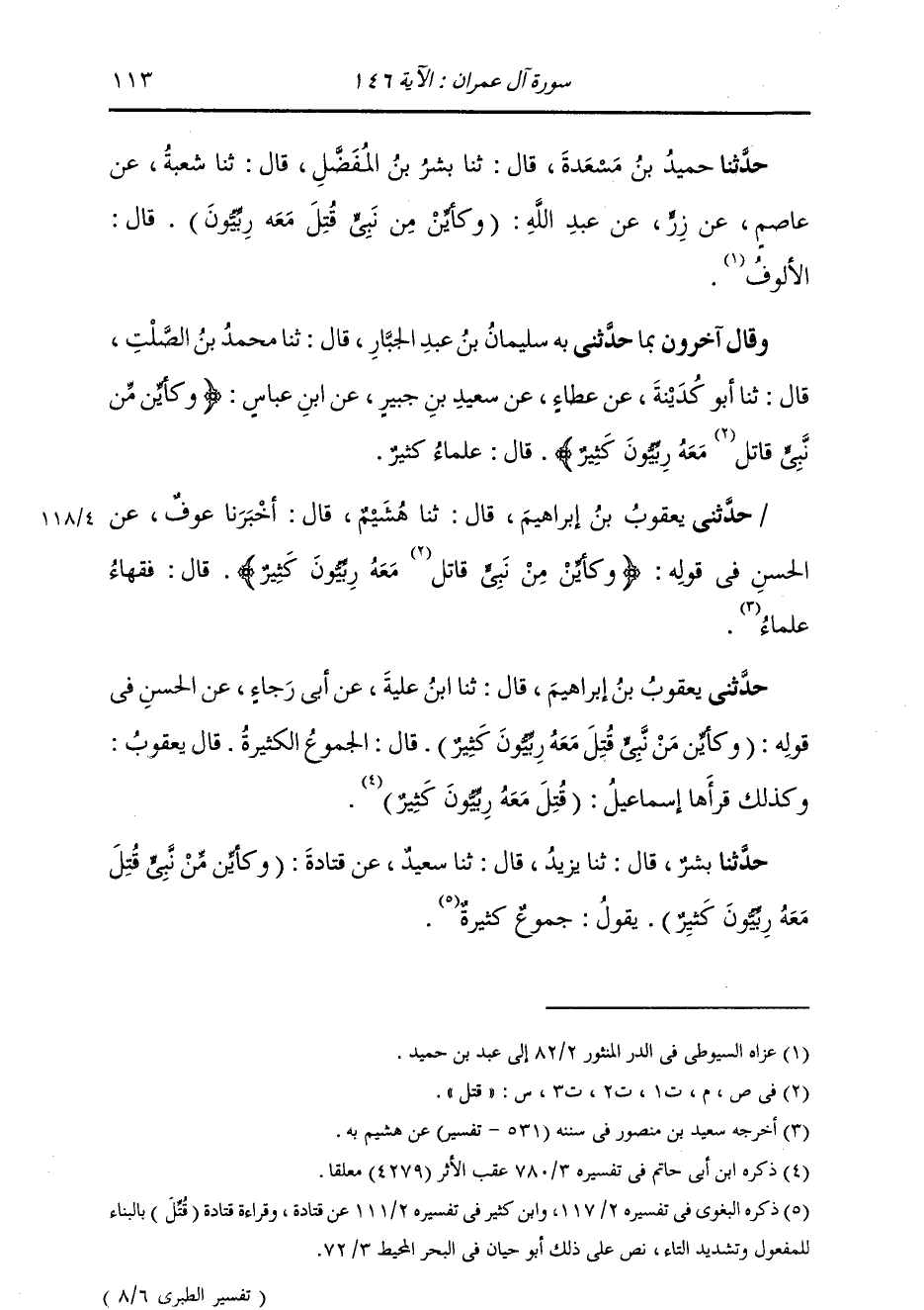حَدَّثَنِي يَعْقُوبُ بْنُ إِبْرَاهِيمَ، قَالَ: ثنا هُشَيْمٌ، قَالَ: أَخْبَرَنَا عَوْفٌ، عَنِ الْحَسَنِ، فِي قَوْلِهِ: (§وَكَأَيِّنْ مِنْ نَبِيٍّ قُتِلَ مَعَهُ رِبِّيُّونَ كَثِيرٌ) قَالَ: «فُقَهَاءُ عُلَمَاءُ»